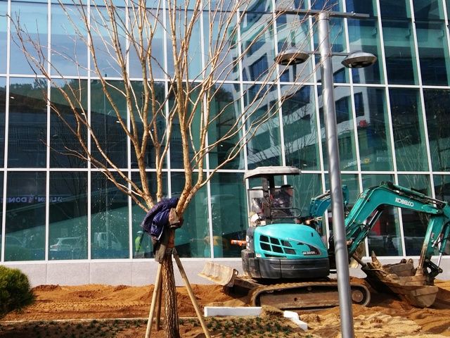 旧把撥駅3番出口のあたりは1か月ちょっと前まで鉄板の塀が築かれていたのですがそれも取っ払われ、ほぼ外観は完成した感じです。周囲の造園作業にも入っていました。(上の写真はロッテモール恩平の南側から撮影)