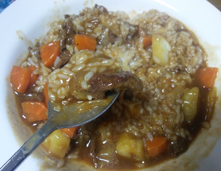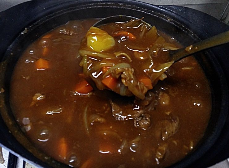 具はいたってオーソドックスな感じでお肉(豪州牛肉+韓国産豚肉)、玉ねぎ、にんじん、ジャガイモ。肉を炒めるときにはチリ産の安い赤ワインを投入、隠し味でショウガとニンニクも入ってます。