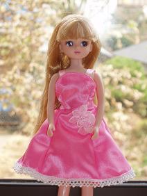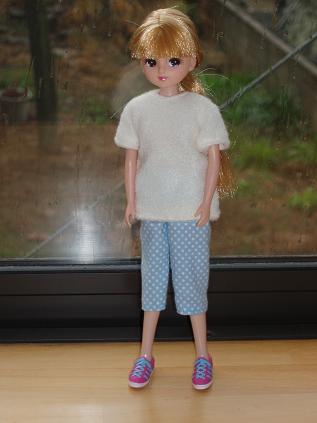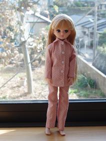 作ってみたいなと思っていたもののひとつ、パジャマを作ってみました。ピンクに白の水玉模様です。よく出来たら姪に送る服の中に入れようと思いましたが、ズボンが細身なので、なかなか小さい子供には着せにくそう。姪と同じ5歳の次男に試しにやらせてみたら、お尻までズボンを上げるのがちょっとむずかしいみたい。なので、パジャマを入れてあげるとしたらちょっと形を変えたほうがいいみたい。次男は上半身裸のリカちゃんを「寒そう」と言って他の上着を着せてました。優しいね。そういえば、このパジャマのズボンを裁断する時に思いました。リカちゃんって足が長いのね~。スタイル抜群だもんね。