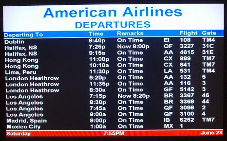 長い出張も終わり、帰りの途につきます。今年80回目のフライトです。AA 185便 20:30発 JFK-LAX行きです。飛行時間は5時間40分アメリカン航空は6月15日から預け入れ手荷物が有料となってます。1個目は$15、2個目は$25です。2個預けると$40も取られことになります。料金説明の真新しい看板が立ってました。チャックインしラウンジに入りました。なにやら空模様が怪しくなって来たな!と思った瞬間雷を伴った激しい夕立です。当然、雷雨のため空港は閉鎖。ああー♪今日はかなり遅れる予感幸い30分位で夕立も小雨に収まりました。しかし、3本ある滑走路の内開いているのは1本のみ、この1本で離発着を行ってます。当然、Taxi Wayは大渋滞です。搭乗時間になり出発案内にも変更が無かった為、一応搭乗口へ行ってみました。なっ、無い 何がって、搭乗機がSPOTにいなのです。っと言うことは、当然Delayって事!「早く言ってよー」とつぶやきながらゲートで待ってました。待つ事20分、やっと来ました搭乗機のB767-200 サン ディエゴから1時間 20分遅れの到着です。「早く、早くー出発準備しておくれー!」との心の叫びなど届く訳も無く、搭乗が始まったのは出発時間を30分過ぎた21:00、この時点で既にかなり疲れたー。搭乗が終わり出発したのは21:30分、この時点で1時間遅れ。でも、何故か滑走路でTaxi中に停止、機長のアナウンスでは「この飛行の離陸の順番が25番目で、離陸には少なくとも40分は掛かる」との事 あーあーしょうがないなーと、首都高の渋滞のような動きの機体の中で、ひたすらたえるそのうち窓の外は、また激しい雨と雷が そして機体のエンジンが完全停止、機長のアナウンスが…「えー、悪い知らせです。空港上にまた雷雲が来ていますので、空港がまた閉鎖になりました。通過するのに30-40分掛かりますのでエンジンを切って待ちます。」もう撃沈です。もう今日は帰るのを諦めて、この非常口から出て空港近くのホテルでべっとの上で寝たい衝動に駆られてます。(窓の外には、同じ狢の別の飛行機が見えてます。)結局ここで1時間待たされ、更に離陸に1時間の3時間遅れで離陸です。到着したのも3時間遅れの夜中の2:30AMでした。到着時のCAのアナウンス(PA)がまた呆れる。「いくら文明が発達しても自然の力には人間は無力です。今日も遅れも避けることの出来ない遅れでした。また次回もアメリカン航空ご利用下さい。」(日本語訳)だとさ!そうかも知れないけどねー、それをそのまま乗客に言うこと無いじゃん。一言くらい思って無くても「遅れてご迷惑を掛けました。」とか「遅れて申し訳ありませんでした。」とか言ってくれたらこちらの疲れも癒されるのにーとっ、思ってしまいました。イヤーかなり疲れた8今年80回目のフライトでした。今回の取得Fly Onポイント1,721 ポイント2008年累計取得ポイント30,741 ポイントJGC プレミア ステータス達成まであと!49,259 ポイントJGC-P ステータス達成率38.43%