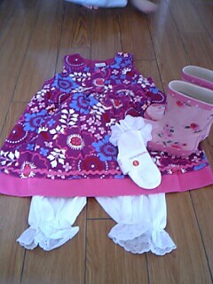 早い!早いですHanna!!昨夜、いつ到着かなぁ?なんて思ってのに!心配してた80と言うサイズも問題ありません。合わせてみたら、ピッタリか大きめでした(苦笑)アドバイスして下さったママさんに感謝♪とっても綺麗なお色で早く着せたいと思う1枚です。初回はお試し、最低送料で送れる購入にしました。そして他のブログで拝見していた長靴。サイズが14しか無かったのですが・・・早速、娘に見つかり履かれてしまいました(苦笑)既に、お気に入りらしいんです(笑)長靴の中で足が泳いでるんですけど(@@)今回のお買い物は大満足です♪