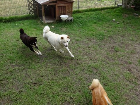 昨日の日中のひとコマ。外は朝から小雨がぱらつくあいにくの空模様となりました。この日はナツマリ結も雨間を縫ってやって来るご近所のちびっ子たちの相手を務めながらのんびりと庭で日中のひとときを過ごしていました。お昼にデスクワークもひと段落したところでしばしナツ結の庭遊びに付き合って見ることとします。私がやって来たことを確認して徐に背伸びを始めるナツ。マリにも外に出て一緒に遊ぶ催促をしてみますが、とりあえずログハウスの中で様子を眺めることにするつもりみたいです。庭遊びの合図に反応したナツと結が揃ってボールを口にして動き始めます。それぞれからボールを取ると揃ってキックオフ開始を待つポーズを取る2匹。結にはこれまでまともにお座りを教えてきませんでしたが、ここのところこうしてミニサッカーの開始時と食事時にナツマリと並んでこうした姿を見せる様になってくれています。(楽)しばし2匹相手のミニサッカーがひと段落したあたりでマリがログハウスから出てきました。私も少々カロリーを消費して腹時計が鳴り始めたところで3匹に遊びの終焉を告げて庭を後にすることとします。先に触れました結のお座りのエピソードからも、犬達には群れの習性が色濃く残っているんだな・・・、そんなことを3匹との柴ワンコライフを通して日々教えられている様な気もします。そう言えばここのところ天気がいい日には、ナツみたくすんごい恰好でお日様と対話してみたり、ドーナツ・スピンを披露する頻度が増えてきている様にも見える結。だんだんナツに行動パターンが似ていくちび子を眺めながら「もう少し女の子らしさが出てくるといいんだけど・・・」そんなことをふと思ってしまうこの頃。(笑)ナツ、おバカモードの指南はほどほどに、お手柔らかに頼むよ。(笑)