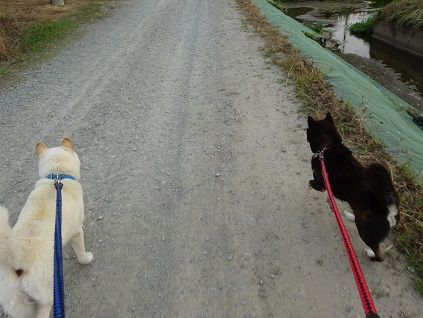 夕方のひとコマ。ロードワークへ出発すべくナツに出発の合図を告げてみますが、いつもの如くボールを抱え込んでお出かけ前の儀式へとこちらを誘う態勢に入ってしまっています。(困)今日は若干時間が押していたこともあり、そんなナツの相手も程々に切り上げることにして早めにボールの回収を済ませると、ドーナツ・スピンで物足りなさを表現して見せるナツ坊。スピンを終えると今度はまた別のボールの獲得に素早い動き出しを見せます。ガウガウ言いながら一見癇癪を起している様に見えるこうした態度もまたナツにとっては私達と単にゲームを楽しんでいる感覚に過ぎない様な気がします。そんなナツ爺のもとへとリードを届けてくれてる様な仕草を見せる結。結は単に爺のリードで遊んでいるのか?はたまた「大爺ちゃま、悪ふざけはその位にしてお散歩に行かなきゃ!」そんなことをナツに伝えてくれているのか??どうなんでしょうね?(楽)いずれにしてもそんな結のお陰もあり、ようやくお出掛けモードのスイッチが入った様子のナツ。この後、この日も普段通りに白黒コンビとロードワークに出発しました。こちらはロードワークを終えてみんなで出かけた夕方の散歩風景。この日も真夏日を記録した福岡南部地方。空には夏の雲が顔を出していました。ロードワークを終えバテバテな白黒コンビとは対照的にこちらはのっけからみんなでのお出掛けにルンルンな結。普段のフォーメーションを崩して好奇心の赴くままに歩を進めていきます。大爺大婆から離れて臨時広場を駆けてみたり、来たるべき田植えに備えてフカフカに耕された土の感触を楽しんでみたりとまだまだそのお転婆ぶりはとどまることを知らないみたいです。(楽)こんなに足跡を残してしまっています。(笑)この日は途中、イヴちゃんに会いました。大喜びでご挨拶に向かった結。遠慮なくグイグイ間合いを詰めていくちび子にちょっぴり引き気味に見えてしまうイヴちゃん。どうしてもイヴちゃんと仲良くなって遊んでみたい結。イヴちゃんのご主人を懐柔して事態の打開を図っているのかな??(笑)こちらは帰途の一枚。再びイヴちゃんに会うことができました。伏せをして結のことを待ってくれていた様にも見えるイヴちゃん。結のお友達作戦も一歩前進か?と思った矢先、向き合っていたイヴちゃんをほったらかしにして畑へとダイブする結。2匹の交流の様子を遠目に見守っていた白黒コンビからは「あ~、あいつは肝心なトコで何やってんだかな~」「あの子のマイペースなトコはナツ、アンタに似ちゃったのかもね」そんな会話が聞こえてきそうです。結の目下の最大の関心事はカエルだったみたいです。ちび子の前足の間をすり抜けて土手の隙前へと逃げ込んだカエルを諦めきれずに探し続けているみたいですね。「結、もう帰るからね。ご挨拶はまた今度ね。」って感じですっかりカエル探しに夢中になってしまった結にイヴちゃんも別れを告げる様に帰途に就きます。イヴちゃん、いつもありがとね。またよろしくね!予報によると週末はこの田舎町の天気も下り坂となる見込みの様です。今年の梅雨入りの知らせが届くのもその辺りとなるのかな??