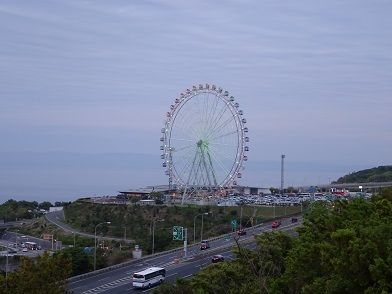 下りのSAの観覧車に明りが灯り始める様子を眺めながら、のんびり楽しい夕食時が