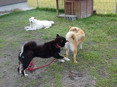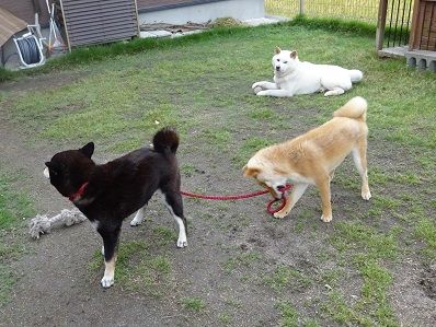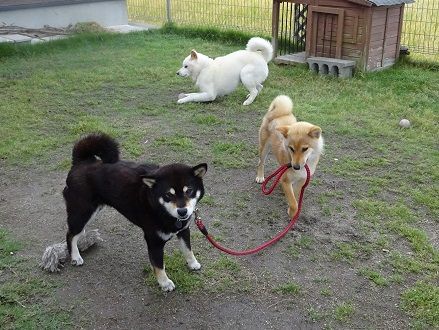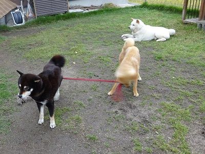 ここのところ散歩前にはこうしてナツやマリのリードを引っ張りながら2匹に出発を