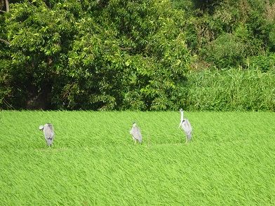 空には夏の雲が浮かび、稲の丈も伸びてきた水田には所々で羽を休める鳥たちの姿が