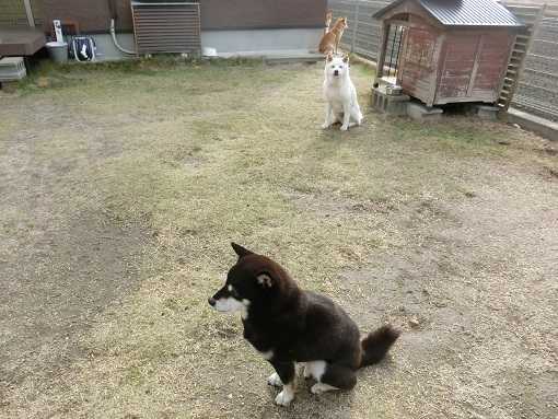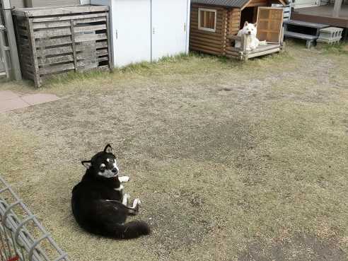 庭では午前中のお昼寝タイムを終えて、のんびり寛ぎながら庭守する白黒コンビの姿が