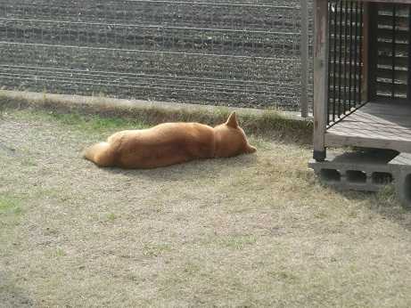 ちょうどお日様が顔を出した庭でのんびり日向ぼっこを楽しむナナの後姿が見えます。