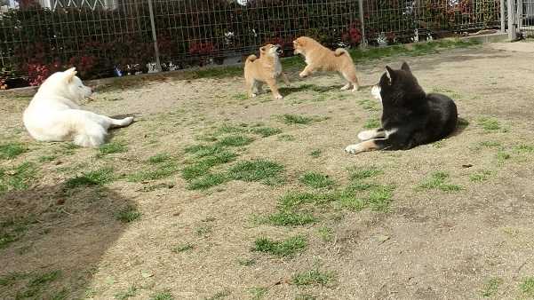 その後、先輩犬たちに見守られながら、庭中を探検したり、群れのルールが理解できる