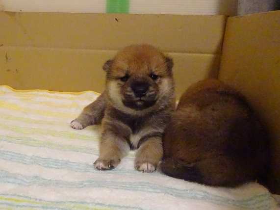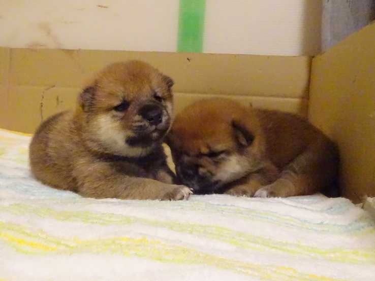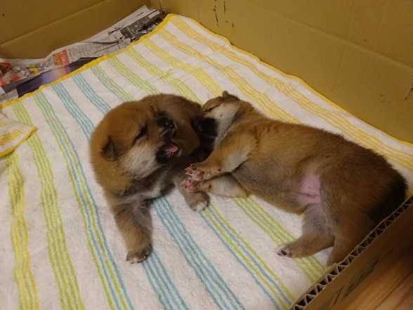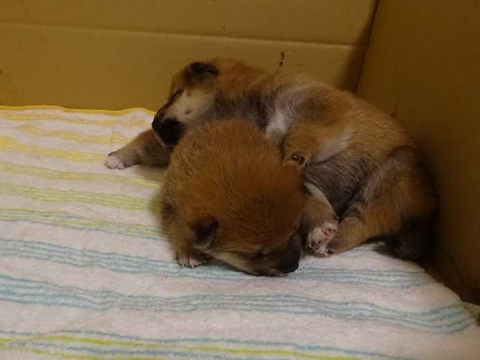 ママさんの御話によると、数日前に揃って目が開いたという2匹。
