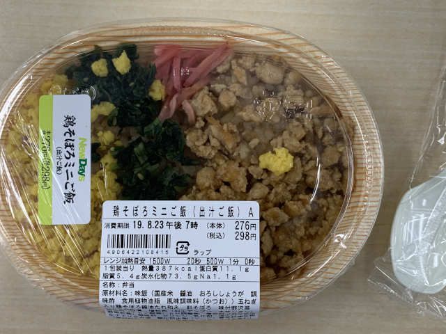 そして8/23の昼食が”鶏そぼろミニご飯”です。よく見るそぼろ入りの3色弁当みたいな感じです。味付きご飯に生姜がよく効いていて、これは当たりでした