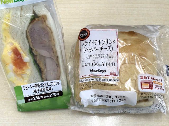続いて1/25の昼食です。ジューシー唐揚げとたまごのサンド、フライドチキンサンドはモバイルNEWDAYSメンバーは割引対象だったので、買って見ました。