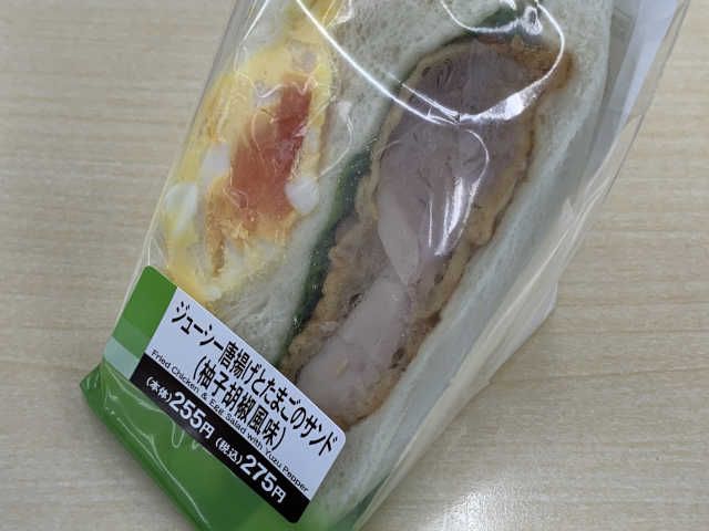 そして柚子胡椒風味のサンドウィッチ。胡椒を大々的に推しているんでしょうか。柚子胡椒は好きなので、全然問題なしですね。パンチの効いた唐揚げと普通のたまごサンドの組み合わせは、なかなか良いと思います。
