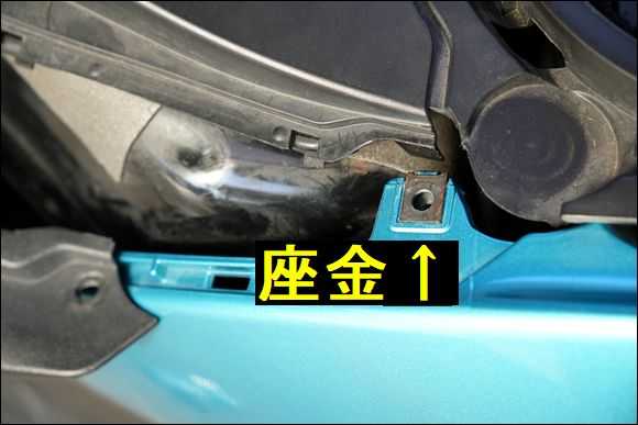 バッテリーの結線を終え、カウルを元通りに取り付ける。この時に苦労した。下の写真はシート下の取り付け部分だが、プラスチックのカウル同士をネジ止するので受けネジの部分に座金が組み込んである。この座金が車体に落ち込みやすい。
