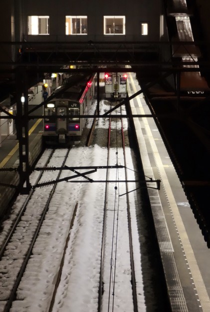出張帰り、盛岡駅に着き、連絡通路を歩いてたら、ホームに電車。窓越しに写真撮ってみました。別な場所からもう一枚。冬の夜の盛岡駅でした。 このところ例年に比べて暖かい日々が続いてたと思ったら、昨日からまた急に寒くなり、雪も強く降ってました。昨夜は凄まじい吹雪。今朝は久しぶりに雪かきしてから出勤となりそうです・・・。 お付き合いありがとうございます。こんなくだらないブログですが、よろしければ応援クリックをいかがでしょう。のランキングがちょっとあがりますのでよろしくです。