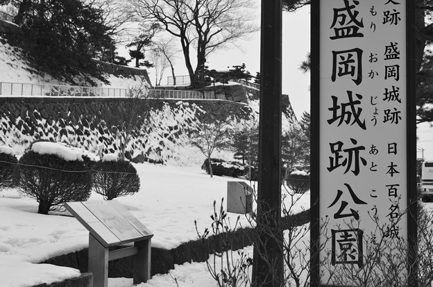 先月の話しなんですが、雪が時々降る中、盛岡城跡公園に行きました。今回は、思い切ってモノクロ撮影してみました。今シーズンの冬はとても雪の多い盛岡です。いつも12月は、寒いけど雪は少なく、石垣が隠れるほどの積雪はあまりないかなぁ・・・。道はカチカチに凍ってて歩くのが大変です。坂を上ると滑って転びそうになりますが、それでもなんとか上の方に・・・。この日は雪が時々吹雪く生憎の天気のため、他に歩いている人はいませんでした。あまりに寂しい風景だったんで、広場に下りて行きました。下り坂はホントに転びそうで危険でしょうがなかったです。雪がさらに吹雪いて来たんで、ちょっと一休み。雪が止みそうになかったんで、カメラが濡れるの覚悟で、広場を歩きました。池の畔には、冬期間中はロープが張ってあり、下りることが出来ませんでした。ホント静かなこの日の公園です。急な階段は危険なため、通行禁止に・・・。池は一面氷に覆われていました。正月はとても賑わった桜山神社です。この日は吹雪の中、その準備中でした。 この風景、ホントは年末の更新で紹介したかったんですが、仕事が忙しくて、編集など遅れて、さらに帰省などで、PC使い難くなってしまい、本日の紹介となりました。まだ、みんな家に泊まってるんで、もう少しの間、PC使用が不便な日が続きます。時間に余裕が出来たら、いろいろなブログにお邪魔したいと思います。よろしくお願いします。 お付き合いありがとうございます。こんなくだらないブログですが、よろしければ応援クリックをいかがでしょう。のランキングがちょっとあがりますのでよろしくです。