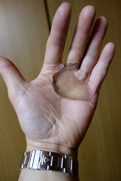2012年1月13日に左手を鋼鉄のローラーに巻き込まれて、1cm弱の隙間に挟まって、潰れてしまって3年経ちました。ぐしゃぐしゃボキボキと音を立てながら手首まで巻き込まれてた左手は、ドクドクと血が流れて野球グローブのように大きく潰れちゃいました。正直、痛みは全然なかったです。神経も切れちゃってたらしいし、痺れていたのもあったし。救急車で岩手医大の高度救命救急センターに緊急搬送されて、手当されました。今でもその状況覚えているんだよなぁ。自分が運ばれた瞬間に10人以上のお医者さんと看護士さんに囲まれ、上着をジョキジョキと切断され上半身裸になって、とりあえず左手の洗浄止血処理しながら、部分麻酔の説明受けて、右手で寝ながらサインして、左肩と首筋の間に麻酔打ちました。麻酔の注射がめちゃくちゃ痛かったです。「手が大きくなるように感じるから教えて下さい」と麻酔科の若い女性の先生。でも、全く麻酔が効かず・・・どうやら怪我する前にコーヒー飲んでたのが原因らしい。更にもう一本。でもダメ。そしてひじに打つ。2本打つも効かず。とうとう手首近くに2本。歯を食いしばるほどの痛みの感じる注射を6本。もう勘弁してと思いながら我慢してると、そしたら主治医の先生が、「ごめんね。もう待てないから縫っちゃうから。痛いのがまんして。」って、3人がかりで縫い始めました。これがまた失神しそうなくらい痛いのなんのって・・・。でもそれからすぐに左手がスイカのように大きくなっていくような感覚に。そこから左手の痛みはなくなり自分も冷静に処置してる部屋を見回す余裕が、脇で看護婦さんが励ましてくれます。そしてその逆から別の女性の先生が輸血についての承諾の説明を。もうすでにいつのまにか点滴と輸血用の管が右手に2本入ってます。カーテンの向こうでは別の患者さんが横たわってます。心筋梗塞らしく重体の様子。あとで聞いたら、残念な結果だったらしい・・・。「よし終了。包帯グルグルにして」と先生。「説明していい?処置の方は終わりました。状況ですけど、まだ分かんないけど元に戻るのは難しいかな。でも動くかもしれないから、しばらく様子みましょう。今日は帰宅して2日後に判断しましょうか。麻酔がもう少しで切れると思うから、そこからは我慢しかないからね。頑張って(笑)」痛み止めと、治療薬をもらって帰宅。麻酔が切れてから2日間激痛で寝れませんでした。そして2日後病院で包帯ほどいたら、これまたまっ黒くなって右手の2倍はある大きさに腫れ上がっていて・・・。黒い糸でたくさん縫われていて、親指と小指のつめが完全にはがれていて、新しい爪が生えてくるまで被せてるため4か所糸で留められています。ホントに野球のグローブようです。思わず自分の左手を見て吐き気がしてきて目をそらしてしまいました。「指の腱は切れてて、筋肉と皮膚は手首から指の途中まで剥がれちゃってます。これの細胞が生きていればそのままくっついて回復するかな。でも黒く壊死しちゃったら移植手術だね。一部は紫色に戻ってきてるからこのまま赤くなってきたら生きてると思うので、そこは大丈夫かも。いやいやひさしぶりにやりがいあったよ。3人で縫ったからね。病院にある針全部用意したからね。30針以上縫ったよ(笑)」その後一部の皮膚が壊死しちゃったんで、皮膚移植手術のため2度入院したのでした。入院中は携帯でブログちょこちょこ更新してました。退院前日に先生に、だいぶ回復してるとお墨付き。「骨も元のようにつながったし」え、骨折れてたんですか。「あれ、言わなかったっけ。まぁ、ほっといても治ると思ったからね(笑)」生命保険用の診断書見たら指3本分骨折してました。自分でも気が付かなかったです。左手のひら3分の1を皮膚移植。下腹部の皮膚を整形外科の若い女性の先生に手術してもらいました。主治医から「美容整形目指してるからお腹の皮をきれいに剥がしてつけてくれるよ(笑)」全身麻酔直前にこんな話。退院して抜糸してとりあえず治療終了。記念に撮った写真です。この日、また手のひらに手術で30針分縫った糸を抜糸。2~3本神経に絡んでたんで、激痛走るも神経が繋がった証拠と先生。そして下腹部の剥がした皮膚の傷口も10針分抜糸。いやいやこのケガでたくさん縫ったなぁ。その後、リハビリを半年別な病院で行なって、残念ながら完全なグーにはならなくなりましたが、普通に生活出来るようになりました。リハビリの病院の先生からは、「もう一回今度は指の手術して、また半年リハビリすれば、もっと曲がるようになるんだけどなぁ」と、残念がられましたが、これ以上休職すると仕事の方に更に悪影響あるので、リハビリ終了してこれにて完治となりました。そこから2年半、今の状況にあるのですが、今回は労災となったんで、治療代もかからず、休職中の給料も労災と生命保険で収入はカバー出来て、結果的にはお金使う事もなかったんで、貯金は増