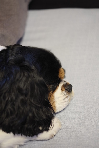 昨日は仕事が久々に休みになりました。朝、テニスの試合をテレビで観てたら、マーチが入って来て、ベッドで寝ちゃいました。ぐっすりと昼寝です。テレビの解説が聞き取り難いほどの大きないびきをかきながら熟睡してます。今月初めからずっと仕事でマーチとほとんど接する事がなかったんですが、だんだん、てんかんの症状である、発作が少なくなってきて、発作で起こる全身けいれんも短くなり、部分的なけいれんがちょっとだけ起こる程度になってきた様子。薬の副作用で、足腰が弱くなってますけど、体力は回復して来て、日中は以前のようにいろいろ動いては怒られているようです。あ、シャッターの音で覚めちゃった・・・。ちょっと迷惑そうにコッチをジロリと見て来たんで、カメラを使うのを止めたら、また深い眠りに・・・。いびきをかきながら熟睡です。また、前みたいに朝の散歩を出来るようになればいいかなと、思いながらマーチの寝顔を見ながら思うのでした。 お付き合いありがとうございます。こんなくだらないブログですが、よろしければ応援クリックをいかがでしょう。のランキングがちょっとあがりますのでよろしくです。