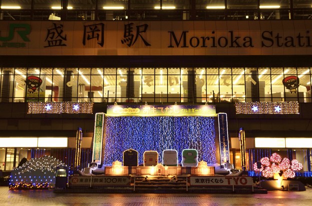 盛岡市内のあちらこちらでイルミネーションが点灯してるので、夜に見て歩きました。まずは盛岡駅の正面広場です。昔は妙に地味なイルミネーションだったんですが、年々鮮やかになってきました。こちらは石割桜をイメージしてます。このあと、盛岡城跡公園でも今シーズンから本格的にイルミネーションが行なわれているとのことなので、行ってみました。盛岡城跡公園内にある、もりおか歴史文化館前のイルミネーションです。大きなツリーのイルミネーションは数秒ごとに七色に変化をし続きます。その周りには小さな灯篭。さて、この大きなツリーに近づいて見ると、使用済みのペットボトルで作成されていました。その中にLEDライトがあり、光を放っていました。なかなか面白い試みかと思います。そして公園の向かいにあるテレビ岩手の庭でもイルミネーション。一昨年からイルミネーションが行なわれているようです。川を挟んだ向こう側では、東北電力の鉄塔がライトアップされています。昨晩は、季節外れの雨で、だいぶ雪が融けてしまいました。他にも菜園のカワトク前、大通りのアーケード、盛岡駅西口の広場などでもイルミネーションが行なわれています。そちらは機会があれば行ってみてみたいです。今が一番寒い盛岡市内でありますが、仙台程華やかなものではないですが、夜にライトアップされた場所を歩いて見るのも良いのではないでしょうか。ホントに寒いので防寒対策はバッチシで行かないと風邪ひきますけどね。 お付き合いありがとうございます。こんなくだらないブログですが、よろしければ応援クリックをいかがでしょう。のランキングがちょっとあがりますのでよろしくです。