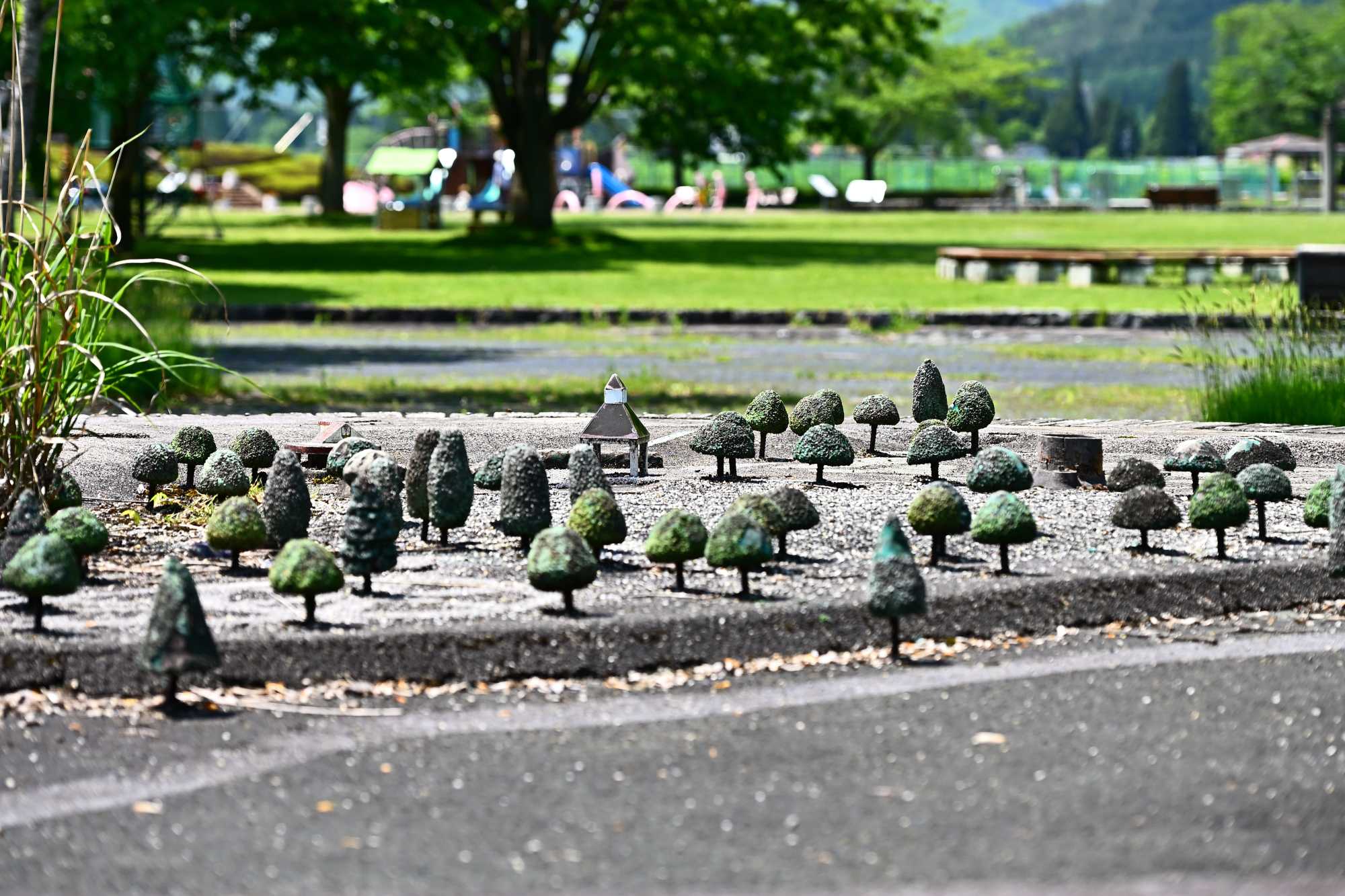 花壇と芝生の広場の間には立体的なジオラマの地図。