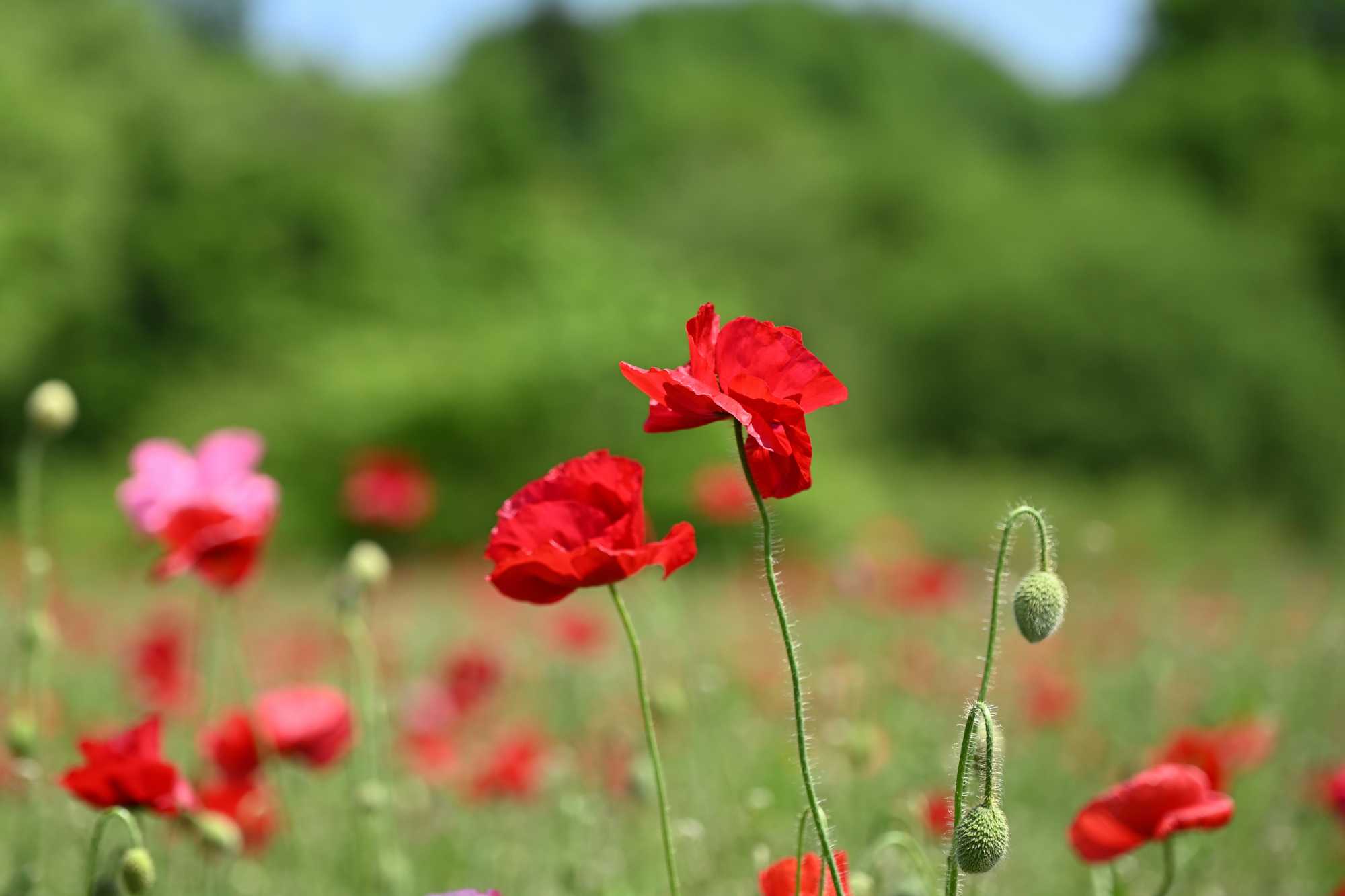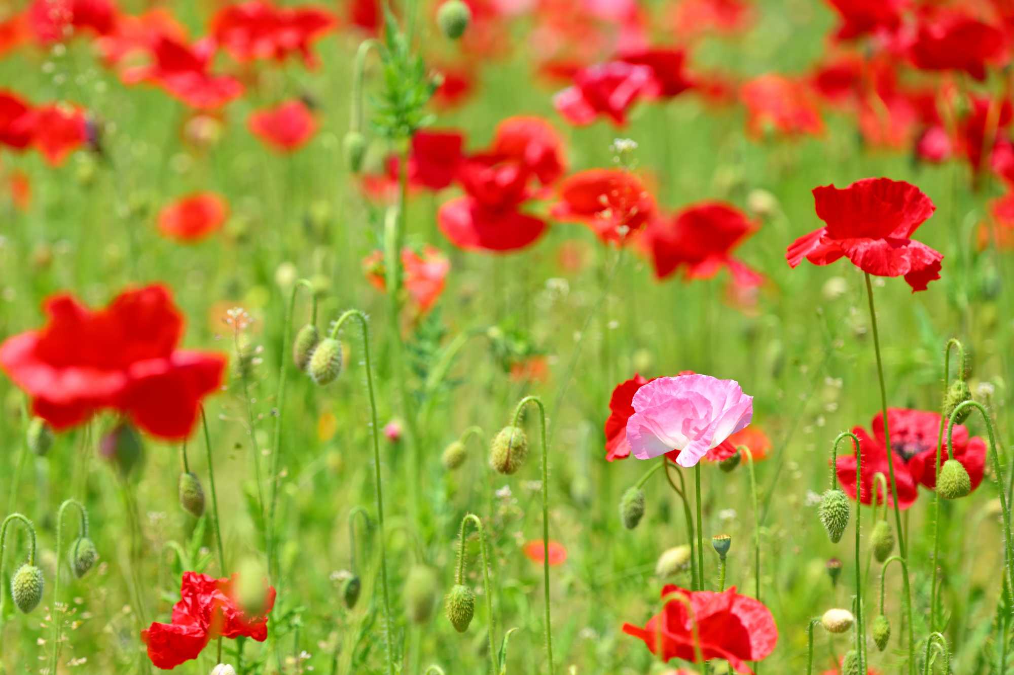 真っ赤なポピーの中にはピンクや白のポピーも。