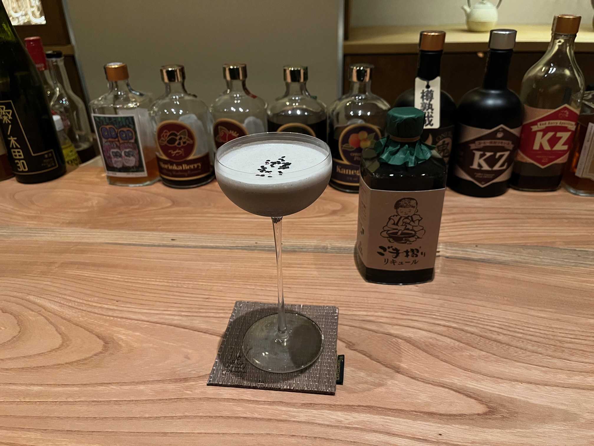 ホイップクリーム浮かせて黒ゴマトッピングされたカクテル。
