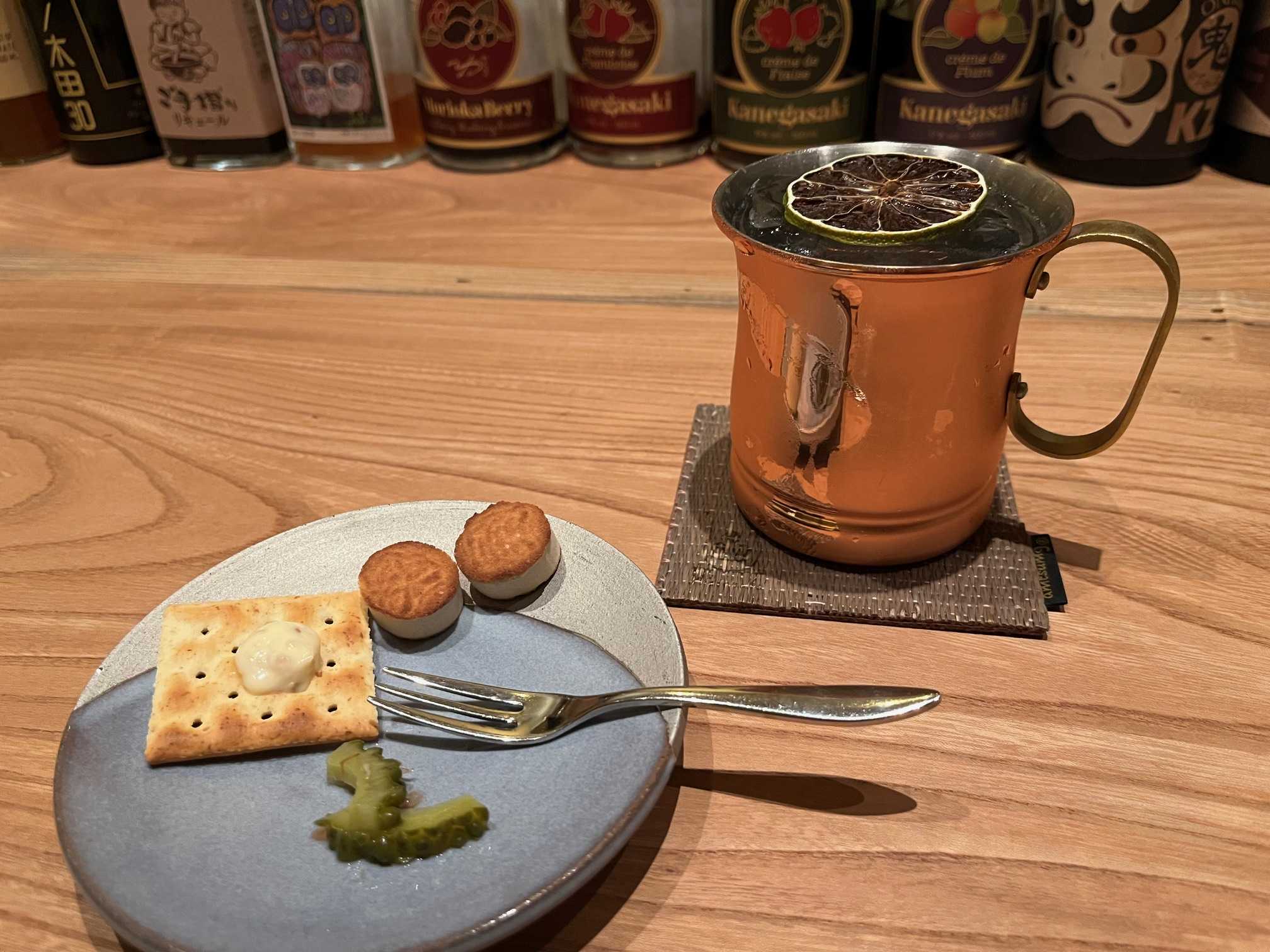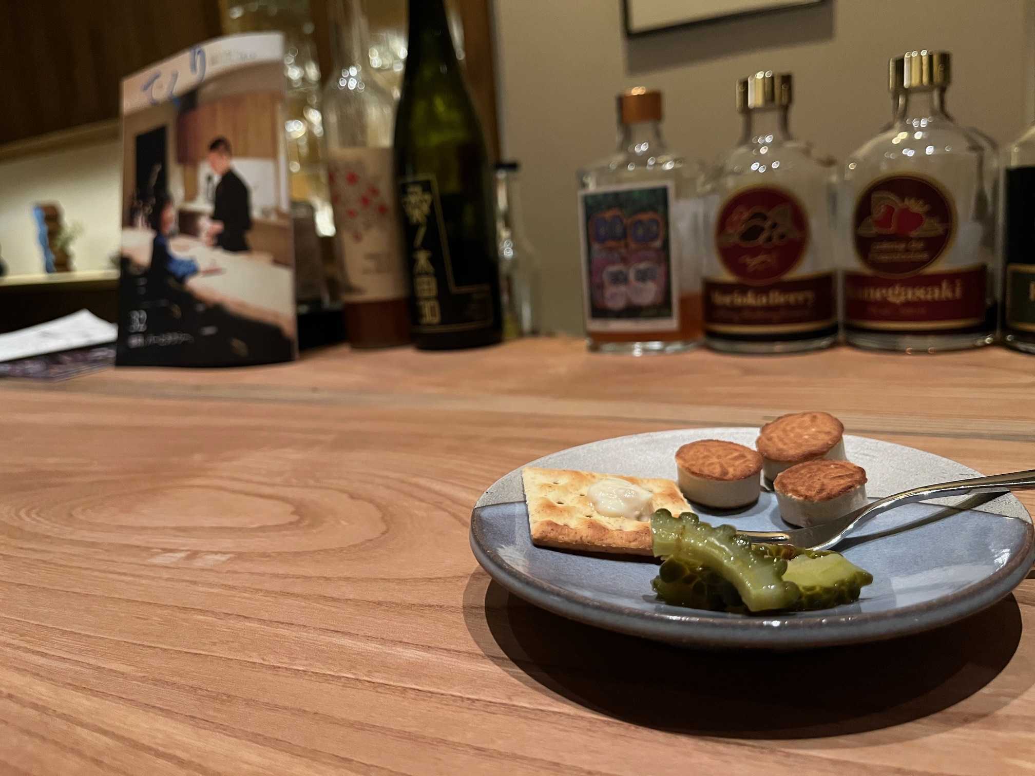チャームは、秋田のもろこし、クラッカーにいぶりがっこクリームチーズのせたものと、
