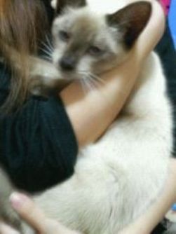 火曜日の朝、子供が道で、猫になつかれてしまって、ついてこられてどうしよう!!と、電話がかかってきました。ひざに乗って甘えてるから動くに動けない。と言うので、猫缶を持って迎えにいきました。食べてる間に帰ろうと思ったのだけど、あまりの甘え方!!しかも車を全く警戒していない!!!これじゃあ車にひかれちゃうーと言うことで、私まで動けなくなり、車を開けたら、さっさと乗り込むにゃんこさん...ぐるぐる回って、車通りの少ないところに行きました。ご飯を食べさせてる間に、後ろ髪を引かれながら、家に戻りました...。うちは6匹いるしー。この子♂だしー。無理だ~~!飼えないよ~~~!!と言い聞かせながら帰りました。が~やはり気になって気になって...旦那にはなしたら、とりあえず保護すれば?と言われたので、慌てて迎えに行きました。にゃんこは道端で動かず、じっとしてましたとりあえず、病院に行き、血液検査をして、のみとりをしました。シャムみたいな毛色で、体重2キロ。小さくて生後4~5ヶ月位に見えます。(病院ではもう少し大きいと言われたけど。)ものすごい甘えん坊さんで、人間大好きっこです。今は子供部屋に隔離中。う~ん。里親探しは大変だぁ…。今、どうやって里親探しをしようか考え中ですーー
