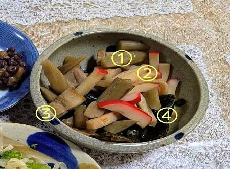 「ふゃぎは」餅に小豆をまぶしたもの(団子・おはぎ)、おかずは①ごぼう②赤かまぼこ③豚肉④昆布、豆腐(本当は揚げ豆腐)は別皿に島豆腐代用しました。赤かまぼこは祝に白かまぼこは法事用になります。