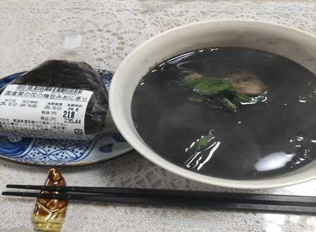 見た目のインパクトがすごいので食欲は失せると思いますが食べるとやみつきになる沖縄の郷土料理「イカスミ汁」です。沖縄では古くから「クスイムン(食養生価値の高いもの)」として珍重されてきたイカスミ汁は、単なる色物ではありません。イカ墨には、イカ本来の旨味成分(アミノ酸)が豊富に含まれており、汁に深いコクと濃厚な風味を与えています。具材にはイカの身や豚肉(三枚肉など)、そして沖縄の葉物野菜である「ンジャナ(ニガナ)」などが入ることが多いです。昔から、頭痛や産後の回復、デトックス効果がある「サギグスイ(下げ薬)」として、健康食としても親しまれています。一口飲むと、見た目からは想像できないほどのまろやかさと、イカと出汁の深い旨味が口いっぱいに広がる事、保証します。沖縄旅行の際や、専門店で見かけた際には、ぜひこのユニークな郷土料理にチャレンジしてみてください!スーパーには「イカスミ(墨)」単品でも販売してます。イカスミを使った沖縄風の炊き込みご飯(ジューシー)、イカスミスパゲッティ、 イタリアでは| イカスミリゾットも有名ですね。左側のイカスミ汁と一緒食べたのが「国産菜の花の梅包みおにぎり」です。最近嵌っているおにぎりです。「国産菜の花」のネーミングに最初惹かれました。それに加え「梅包」、菜の花&梅のコラボが一口食べると、口の中がリフレッシュされ、また次の一口を美味しくいただけました。シンプルな食事でしたが至福でした。ポチッと激励をお願いしますも何とか☆P~