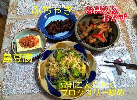 十五夜の「うさんでー」です。沖縄方言「うさんでー」の意味は、供物をいただくこと。神仏やご先祖様に供えたお供え物をお下げして、皆でいただくこと。ご先祖様や神様が一度召し上がったお供え物をいただくことで、そのご加護や恩恵を子孫も受け取ることができる、という信仰や願いが込められています。通常、いだだきます、がその時は「うさんでーさびら」と頂きます。通常の食事にお供えの「ふちゃぎ」&「おかず」を加えてあります。「ふゃぎは」餅に小豆をまぶしたもの(団子・おはぎ)、おかずは①ごぼう②赤かまぼこ③豚肉④昆布、豆腐(本当は揚げ豆腐)は別皿に島豆腐代用しました。赤かまぼこは祝に白かまぼこは法事用になります。主食のおかずは友人が友人から頂いたお裾分けのお裾分けです。茹でずに水洗いだけで食べられると言う、中川食品の「豆乳でつくったこんにゃく麺 カロリーOFF麺 糖質0g」18Kcalにブロッコリーを炒めました。沖縄でも買えるのに?と言うと買えない、との返事でした。福岡県北九州市小倉南区で製造されたもので沖縄のスーパーにはない、と言われました。沖縄は「まえさと」こんにゃく一択と言っていいほど店頭を占めています。ポチッと激励をお願いしますも何とか☆P~只今、ランキングに参加中ポチっとupupクリックお願いしますy(^。^)。o0○。