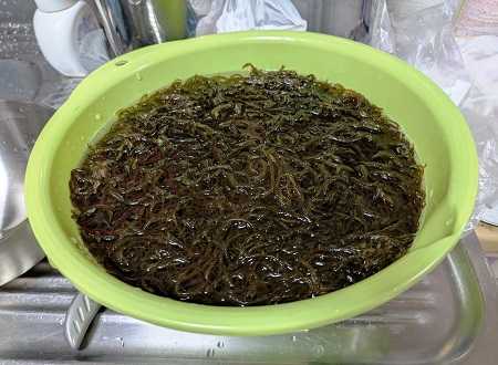 冷凍していたもずくの塩抜きをしているようです。その後、水気をしっかり切って酢の物、味噌汁用に小分けして更に冷凍保存し、残りは「もずく天ぷら」にするそうです。我が家はもずく(水雲・海雲・海蘊)をスーパーで購入した事がありません。もずくの生産量は、沖縄県が国内の99%以上を占めています。中でも、うるま市(勝連地域)は、約4割を占める、最大の産地です。妻は勝連の出身です(ユネスコ世界遺産「勝連城址」がある地)。妻の同級生、明夫は中学校を卒業すると父親の跡を継ぐため漁師になり、もずくの養殖業も兼ねるようになりました。明夫とは結婚式、妻の親戚祝い等で意気投合して長いお付き合いをしています。明夫はもずく収穫の時期には一斗缶をオンボロ軽貨物車で毎年片道約一時間かけて我が家に届けてくれます。時には新鮮な魚の差入もあります。届けると休む間もなく同級生の美代子・良和・恵の家にも届ける予定があるからと向かいます。明夫は30代半ばでマイホーム(もずく御殿)を新築しました。ある日、義兄も一緒にゴルフに行くことになり、送迎してくれると言うので待機していると見たことのない高級車ベンツで迎えに来たときには正直もずく養殖業に転職しようかと思いました。冗談めいていろいろ質問してみると新規参入は漁業権の法的取得、組合加入、技術研修等困難だと知らされホントに隣の芝生は、状態でした。感謝しながら市販のもずくのタレ(シークァーサー味)で毎食頂いています。ポチッと激励をお願いしますも何とか☆P~只今、ランキングに参加中ポチっとupupクリックお願いしますy(^。^)。o0○。