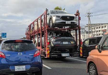 キャリアカーには、「わ」ナンバーの車両が何台も積み重ねて運ばれています。左側走行の「れ」ナンバーもレンタカーです。公的なデータでも、沖縄県は中古車購入による自動車の所有数量が全国で非常に高いそうです。公共交通機関が本土に比べて少ない沖縄では、日常の移動手段として自家用車が生活に不可欠です。そのため、新車・中古車を問わず自動車の需要自体が非常に高いです。中古車の「供給」が多い理由のひとつに沖縄は観光地であるため、レンタカーの需要が非常に高く、観光シーズンが終わった後などにレンタカー上がりの車両が大量に中古車市場に放出されます。これにより、整備記録がしっかりした同型・同年式の中古車が多く流通します。本土からの輸送費などのコストが上乗せされるため、新車・中古車ともに本土より価格が高いので新車よりも中古車の方が初期費用を抑えられるため、中古車を選びます。また、海に囲まれているため、本土と比べて車の下回り(アンダーボディ)のサビや塩害による劣化が進みやすい環境にあり、新車に高いお金を出すよりも、数年で乗り換えることを前提に中古車を選ぶ方が多いです。今はないですが以前悪質業者がニコイチ(車体の接合)事故歴・修復歴がある車両を隠匿して販売し摘発されたケース(◯◯モーター)が話題になりました。ウチナーンチュは車検前になると中古車センター、展示会場回りを始めます。車検を受けるより車種乗り換える方が多いです。数週間で乗り換えできるメリットもあります。新車は納車期間が長く(私は半年待ちました→それでも早いと言われました)、その前に車検が切れる、ディーラーで下取りしても安価、代車サービスは在庫次第で車種が選べない、期間で有料になる等検討事項が多かったです。リタイア前は名義変更だけで済む新古車(中古扱い)が多かったですが新車の納車は待ちくたびれました。多分、人生最初で最後の新車購入になると思います。ポチッと激励をお願いしますも何とか☆P~只今、ランキングに参加中ポチっとupupクリックお願いしますy(^。^)。o0○。