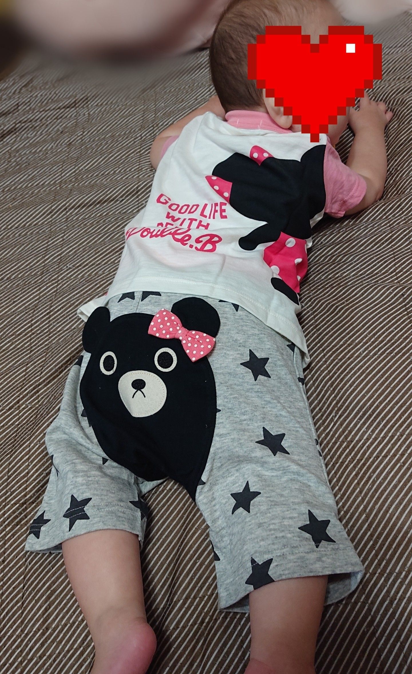 次女用に購入した、ダブルBサマパ 80。 可愛くて眺めているだけで幸せですが、大事にとっておいてもサイズアウトするだけなので、早速着せてみました! 今回のコーデは、Tシャツとおしりが可愛いパンツです。 これ、組み合わせたら、 ほし ほし くま くま で、しつこいかなぁ(笑)?と思ったんですが💦 可愛いーー♥️ おしりがとっても可愛い! 表側です。 ほし ほし くま くま でも、全然おかしくない。 ↑TシャツのB子ちゃんが良く見えないので、ちゃんと写っているものです。 赤ちゃんって、寝っ転がりながらおしりをぐぐーっと上に持ち上げる仕草しません? その時に、おしりの裏側からB子ちゃんがチラチラ見えるのもたまりません😳💦 お耳とリボンが立体的になっているので、動くたびにお耳が揺れて可愛い!! 一つのコーデで、こんなにも色々な角度から撮ってしまった😂 多分、3歳の長女はサイズがあったとしても、ここまで似合わないと思うんですよね。 このおしりパンツは、ハイハイ時期ならではの可愛さが計算し尽くされてる感じがします。 大満足のサマパ、着せてもやっぱり大満足でした! 【夏物アウトレットセール】ミキハウス ダブルB(DOUBLE.B) おしりにBくん&B子ちゃん★星柄6分丈パンツ(80、90) エントリーでポイント10倍!お買い物マラソン期間中/ミキハウス正規販売店/ミキハウス ダブルビー mikihouse メガ!!Bくん&B子ちゃんの半袖Tシャツ(80cm・90cm) ダブルB(DOUBLE.B)mikihouse 2020年入荷サマーパック 1万円夏物セット<BR>(80cm、90cm、100cm、110cm、120cm、130cm、140cm、150cm) mikihouse(ミキハウス) DOUBLE_B(ダブルビー) 盛だくさん4点入ってます 福袋 夏 [サマーパック](メーカー作成公式 夏物福袋) [送料無料♪] サマーパック2020年(64-9914-610 ) 【クーポン除外品】【DOUBLE B ダブルビー】2020年サマーパック福袋1万円(80cm-110cm) エントリーでポイント10倍!お買い物マラソン期間中/ダブルB(DOUBLE B)ダブルビー1万円(税別)☆サマーパック(福袋) 男の子・女の子(80cm・90cm・100cm・110cm・120cm・130cm・140cm・150cm)[福袋] ダブルビー 2020年サマーパック福袋 1万円【男の子用】【女の子用】80cm~150cm ダブルB ダブル・ビー ダブルビー サマーパック DOUBLE_B [80-150cm][64-9914-610] 2020 夏 福袋 ダブルB(DOUBLE B)ダブルビー1万円(税別)☆サマーパック(福袋) 男の子・女の子(80cm・90cm・100cm・110cm・120cm・130cm・140cm・150cm)[福袋]