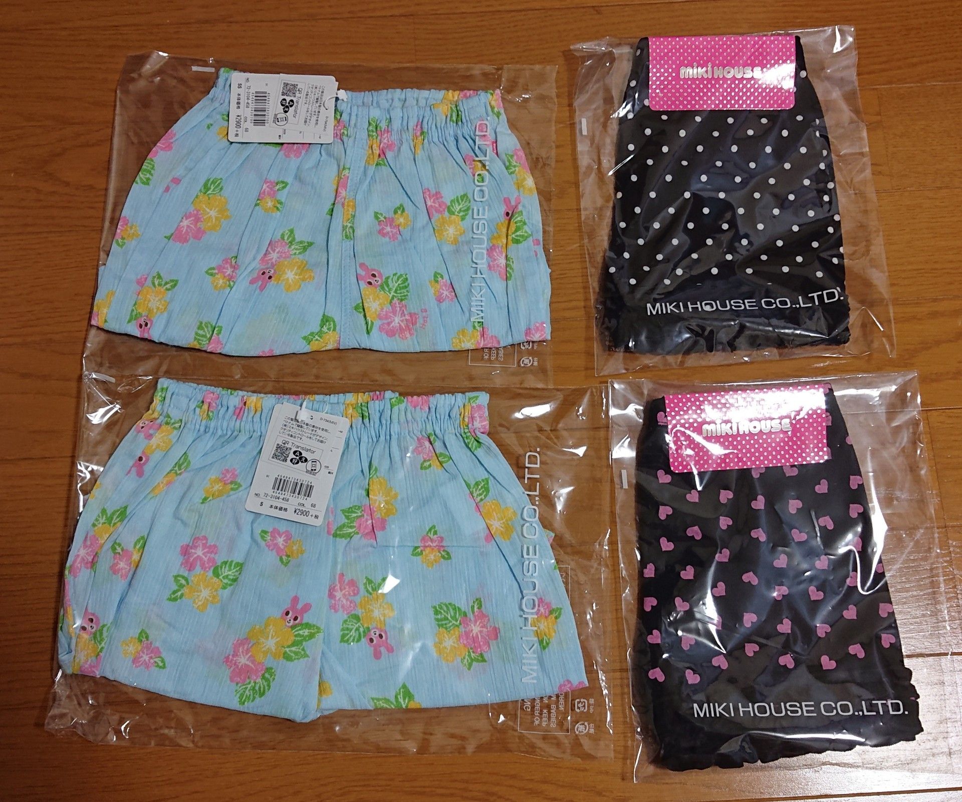 先日購入した、ダブルBとミキハウスのB級品福袋。 土曜日に2点とも到着しました! 今回は両方、MHparkさんにて購入しております。 まず、ダブルBの方からネタバレを書きたいと思います。 ダブルBは私が見たとき、確か女の子は80、100、120が残っていたように記憶しており、80の夏物はもういらないし、120は先買い過ぎるので、100をポチ。 100は今すぐ着るなら、長女用ですかね。 ダブルBのB級品福袋は、時報ポチのときなら瞬殺でなくなるので、買えたことが嬉しくてワクワクしていました(^_^) …が。 とりあえずネタバレにします。 以下、ダブルB B級品福袋 女の子100です。 ↓開けます。 ガーン😱手持ちとの被り多っ!!💦 黄色Tシャツ 8800円+税 水色七分袖シャツ 7500円+税 パラシュートタンク 5500円+税 ハイビスカススカート 6500円+税 デニム風パンツ 6100円+税 チェック柄ワンピース 8800円+税 総額43200円+税=47520円でした。 Bスタンプは一つもなかったし、総額もわりと高い方かと思います(76%オフです)。 ですが…何せ被りまくりました😭 順番に見ていきます。 アフィありませんでした、黄色Tシャツ。 画像は他サイトからお借りしました。 これは持ってないし、Tシャツは普通に使えるので、まあアリです。 アフィありませんでした、水色Tシャツ。 水色というか、エメラルドグリーンですかね。 画像は他サイトからお借りしました。 初め半袖だと思って、まあ仕方ないけどTシャツばっかり増えるなーと思ってたら、七分袖でした! 七分袖嬉しい!微妙な気温のときに重宝するんですよね。 背中のお花のレースも可愛いし、これは良かったですよ。 次女の分も揃えて欲しくなりました(^_^) そして一番衝撃的だったのが、こちらのパラシュートタンク…。 【セール40%OFF】ダブルB ミキハウス Double B by MIKIHOUSEパラシュート柄ティアードタンクトップ【日本製) 【キッズ】【メール便可】 これ、先日ポチした次女サイズのサマパに入っていて、長女サイズも欲しくなって、わざわざ追加で100を購入したところだったんです。 こんな被りかたある??😭 とは言っても、B級品福袋の方が後から販売されたし、もう本当に偶然すぎる引きの良さで、これ見つけた瞬間、しばらく固まってしまいました(笑) はい、そして次。 こちらのハイビスカススカート。 (アフィはありますが、古い商品だからなのか画像は出ません。) 【ポイント10倍】〇【ミキハウス】【SALE】スカート7100【3,980円以上で送料無料(国内)】 色違い持ってまーす😂 見事に被りその2。 次々行きます。 こちらのデニム風パンツ。 【SALE】ストレッチニットデニム 6分丈パンツ(100cm・110cm)<BR>[ミキハウス ダブルB][セール][アウトレット] 全く同じではありませんが、ウエストの柄以外ほとんど同じもの持ってます😂 上に見えるドット柄の方が、元々の手持ちです。 下の未開封の星柄の方が、今回入ってたもの。 違う商品ではありますが、これは個人的に被りにカウントしたい気持ちです😭 見て下さい、これ。 一番右(次女用80)と真ん中(長女用100)が、元々の手持ちのもの。 左の未開封のが、今回入っていたもの。 ウチは二人姉妹なんですが(笑) 100サイズ着られる方、もれなくもう一名様、ウチの姉妹ズとお揃いで三つ子コーデ出来ますよ(笑)😂 最後です、こちらのワンピース。 【【ポイント10倍】セール 6/28 00:00 START】【ミキハウス】ワンピース8800【3980円以上で送料無料(国内)】 これは嬉しい!! 先日の次女のサマパに入っていたワンピース、別の商品ではありますが、雰囲気が似ているので、しれっとお揃いのように着せます(笑) と、いうわけで。 黄色Tシャツ→まあ着るかな 水色七分袖シャツ→嬉しい パラシュートタンク→被り1 ハイビスカススカート→被り2(色違い) デニム風パンツ→被り3(柄違い) チェック柄ワンピース→嬉しい 商品が悪い訳ではないんです。 被りを引き当てすぎました。 約3年半前、長女が産まれてから、うさぎさんが好みでホットビとミキハウスのお洋服ばかり購入していて。 ダブルBに手を出したのは、今年に入ってからなんです。 それまでダブルBのお洋服は持っていなかったんです。 被りなら圧倒的にミキハウスの方を心配していたので、まさかダブルBが半分も被るなんて予想外でした😭 うむむー…。(様々な感情。) えっと、気を取り直して、次の記事ではミキハウスの方のネタバレを書きますね(^_^) ここまでお読みいただき、ありがとうございました✨