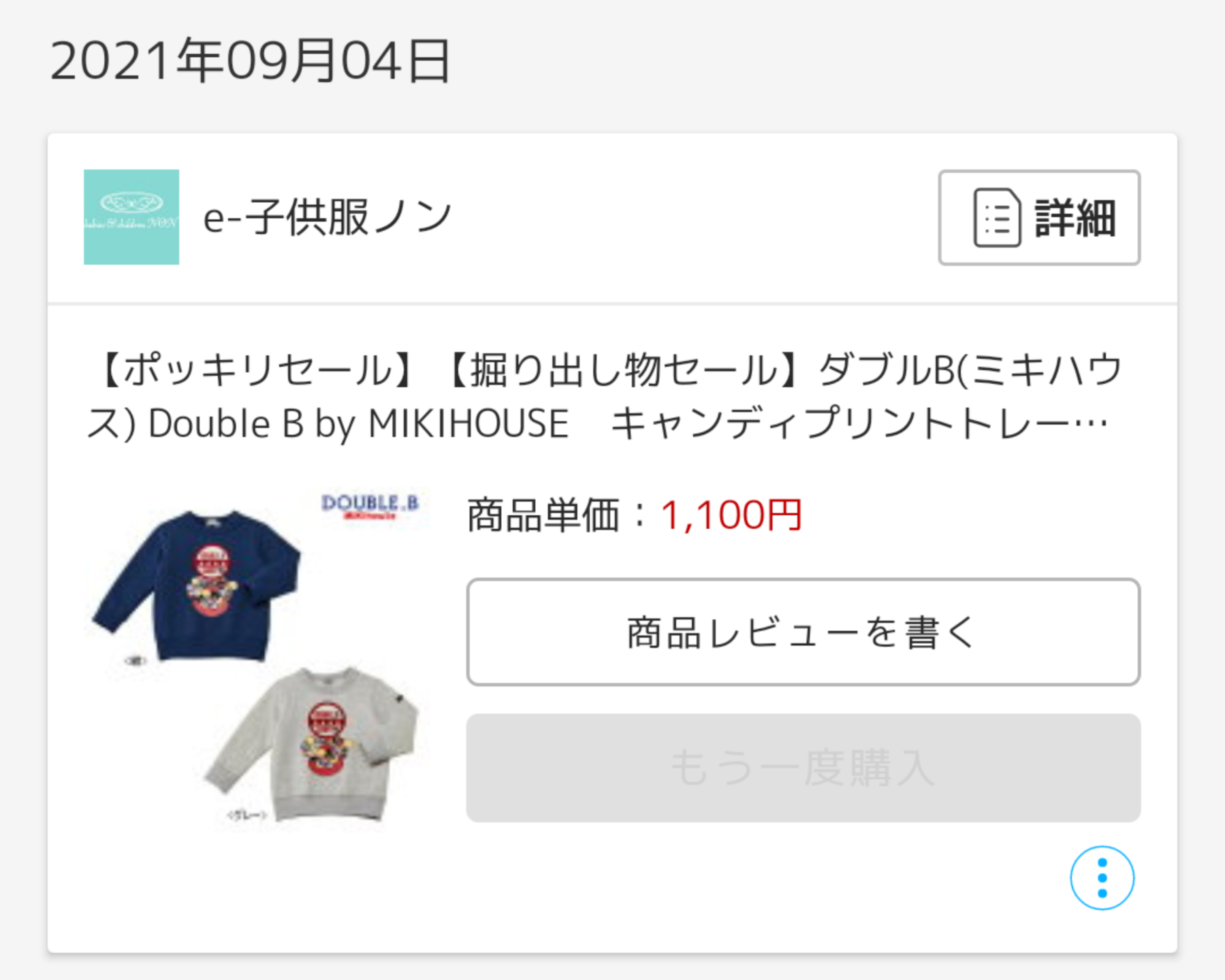 写真使いまわしですが、ミキハウスの方の限定トレーナーも、結局本店ファミセでサイズアップ買っちゃったし。