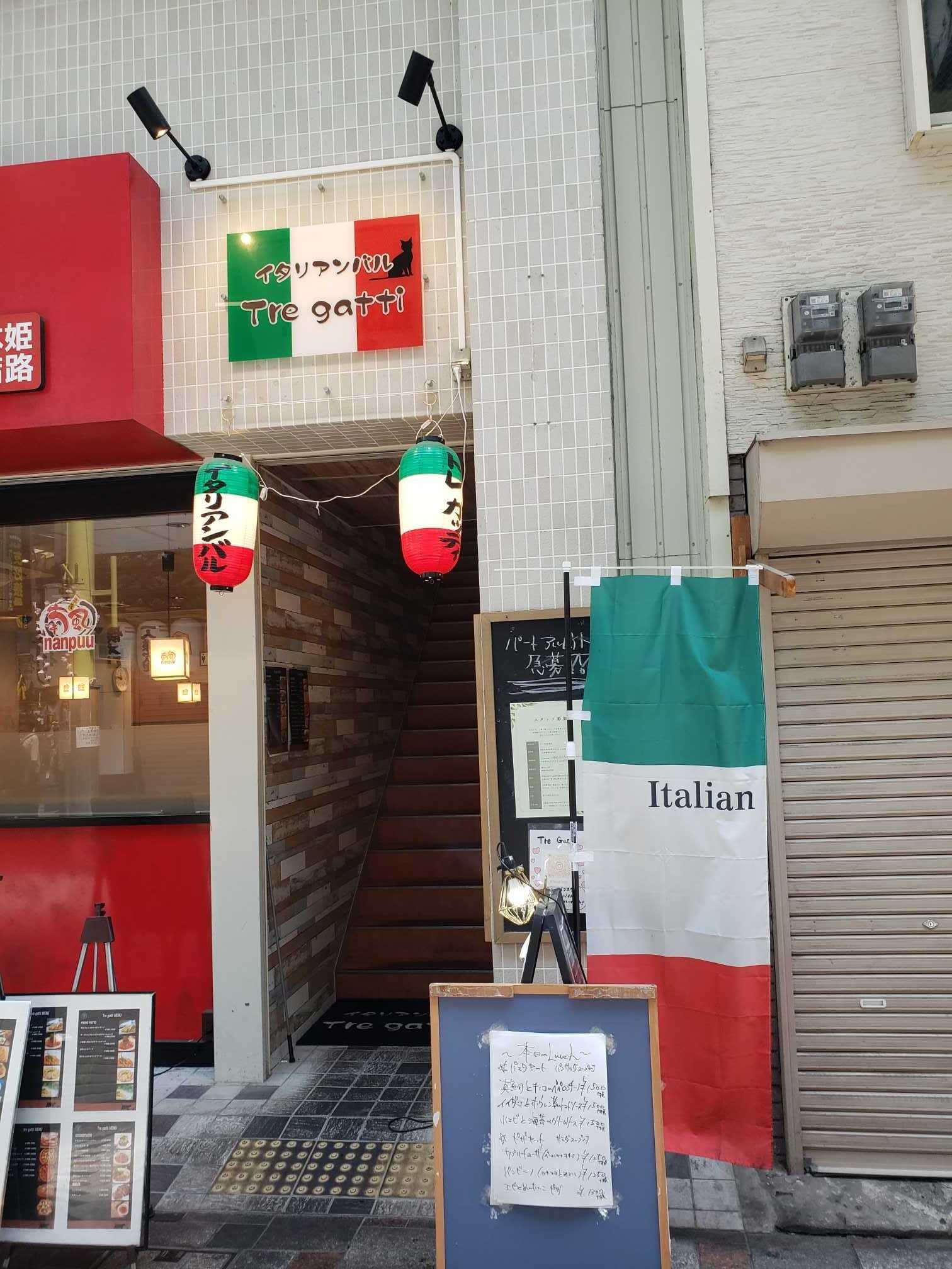 JR姫路駅からおみぞ筋に入ってすぐ。ビルの2階にある隠れ家的イタリアンがあります。ちょっと急な階段を上がります。一番上まで行くとすぐに入口登場。では、いざ、突撃!まずは厨房を囲むカウンター席がくの字に並ぶ。テーブル席も結構ありますね。そしてカジュアルな雰囲気がいい。メニュー物色。パスタランチ3種、ピザランチ3種のラインナップ。おススメの酒の肴はリーゾナブル。ランチ以外のパスタ&ピザメニュー。季節ものを使う。レギュラーメニュー。アヒージョの種類多し。メニューを見てるだけでワインが欲しくなって来た。ピザも7種類あるので、大勢で行ってシェアがいいね。赤ワインリストとワインカクテルリスト。いろいろありますぞ。白ワインも種類豊富。カクテルメニュー。びっしり1ページ。入口にある冷蔵庫とワインセラーにもボトルが所狭しと並ぶ。今日は仕事休み、もちろん昼飲みデーですよ。生ビールからスタート!うんまい!オーダーしたのは、入口の黒板にあった「昼飲みセット」。生ビールは+100円なので、1,500円(税別)ですね。「昼飲みセット」のお料理配膳!ぐうぉぉ!何ちゅうボリュームじゃ。エビガーリックアヒージョ、サラダ、生ハムポテサラ、ローストビーフ。ちょっとだけじゃなくて、しっかり一人前!うんまい!!!ここで赤ワイン登場!まだまだ昼飲みセットの料理が残ってますよ。3杯は行けるな。締めに移ろう。パスタランチセットから「真鯛とキノコのぺペロンチーノ」をオーダー。ランチセットの前菜。何て立派な前菜だろう!どれもこれも、うんまい!!パスタとバケット登場!これだけ付いて1,500円(税別)はお得感満載。真鯛とキノコの具の量がすごい。染み出る食材のエキスがパスタに絡みついて、うんまい!!パリッと焼いたフランスパン、パスタソースに浸してガブリ!うんまい!!しかし、コスパの良いお店やったなぁ。美味しかったぁ(^O^)ごちそうさまでした。■店名:イタリアンバル Tre gatti(トレ ガッティ)■ジャンル:イタリアンバル■住所:兵庫県姫路市東駅前町57 あらきビル 2F■TEL:079-226-9011■営業時間:11:30 - 15:00(L.O. 14:00)17:00 - 00:00(L.O. 料理23:00 ドリンク23:30)■定休日:月曜日■食べログ:https://tabelog.com/hyogo/A2805/A280501/28068107/☆ランキング参加中☆下の3つのバナーをポチッポチッと押して下さい。ご協力お願いしますm(__)mにほんブログ村近畿地方食べ歩きランキング食べログランキング☆食べログ個人ページhttps://tabelog.com/rvwr/tamao/【島玉夫の過去ブログ】◇続.播磨の国は食マルシェhttps://plaza.rakuten.co.jp/harima2/diary/◇播磨の国は食マルシェhttps://plaza.rakuten.co.jp/harimanokuni