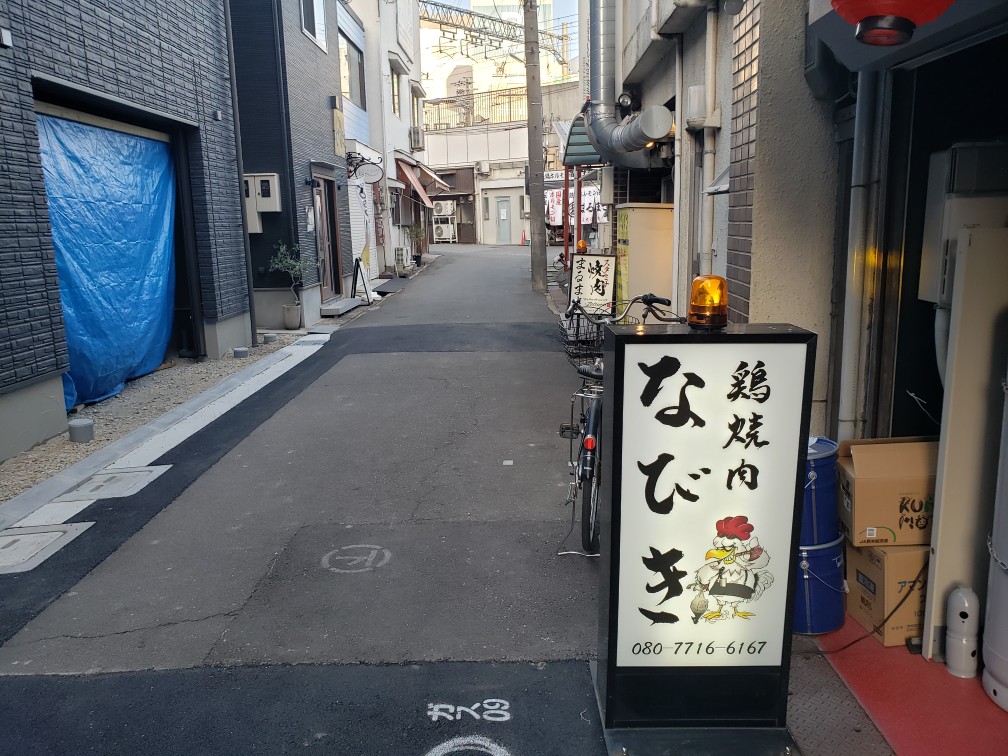 突き当りに見えるのは、山陽電鉄の線路。この路地にあるお店が今回のターゲット。いわゆる焼鳥屋さんですが、串焼きタイプではなく、セルフで焼く焼肉スタイル。楽しみですね。では、いざ、突撃!入って右手にくの字のカウンター席。左手にテーブル席が2卓。ロースターのシルバーの配管が剥き出しで、何かの工場みたい。そして、今回はカウンター席右端っこに陣張り。すぐに生ビールをオーダー。キンキンに冷えてやがって、うんまい!一応テーブルアイテムも確認。メニュー物色。鶏はブランド系も揃える。牛も有りますよ。まずは肝刺し、たたききゅうり、鶏系から鶏皮とこころを、牛系から塩タンと油かすをオーダー。酒メニュー、ワインがないな。付き出しはキャベツ。たたききゅうりはポン酢仕立て。さっぱりして、うんまい!肝刺し。トゥルントゥルンで甘くて、うんまい!!牛塩タン。1人前の量が結構多いな。鉄板も温まっているので、焼いて行きますよ。焼けました!これで半分。軽くレモンに付けてパクリ、うんまい!このあたりで、いいちこ水割りにチェンジ。うんまい!左が百日鶏の皮、右がこころ。「にんにくは入れますか?」と聞かれたので、「お願いします」と返答。濃厚な塩だれで、にんにくの利きもバツグン。これは珍しい油かすの焼肉。油かすは良く焼いて下さい、とのこと。焼ける直前で、角ハイボールにチェンジ、これらの料理にはハイボールがよく合うな、うんまい!油かすはカリカリになるまで焼いて見た。このタイミングでタレも登場。油かすの香ばしさがたまらん、うんまい!!ハイボールもうんまい!!しっかり塩の味が付いているが、タレを付けるとほんのり甘くなって、うんまい!!こころも食感が心地いい、うんまい!これは、いい酒が飲めた!ごちそうさまでした。■店名:鶏焼肉 なびき(靡)■ジャンル:焼鳥 焼肉 居酒屋■住所:兵庫県姫路市久保町59■TEL:080-7716-6167■営業時間:11:00 - 14:30 17:00 - 00:00■定休日:未確認■インスタ:https://www.instagram.com/toriyakiniku_nabiki/■食べログ:https://tabelog.com/hyogo/A2805/A280501/28072949/☆ランキング参加中☆下の3つのバナーをポチッポチッと押して下さい。ご協力お願いしますm(__)mにほんブログ村近畿地方食べ歩きランキング食べログランキング☆食べログ個人ページhttps://tabelog.com/rvwr/tamao/【島玉夫の過去ブログ】◇続.播磨の国は食マルシェhttps://plaza.rakuten.co.jp/harima2/diary/◇播磨の国は食マルシェhttps://plaza.rakuten.co.jp/harimanokuni