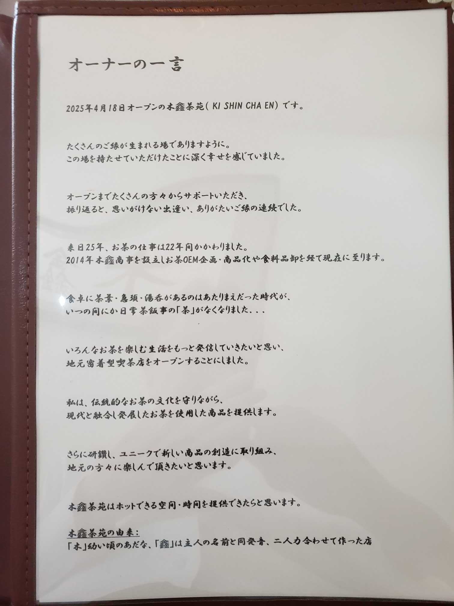 加古川市立平岡小学校の横に新たなカフェがオープンした。 「木鑫茶苑」というお店、「キシンチャエン」と読みます。どうやら中国茶がメイン?では、いざ、突撃!入って右側に2人掛けテーブル席が3卓。正面がカウンター席と厨房。いまのところカウンター席は使っていないみたい。4人掛けテーブル席が1卓。この日も女子会が行われていた。中国カフェらしく、急須やお茶関係の陶器が飾られています。これも中国カフェらしい、縁起のいいものが飾られていますよ。そして、今回はカウンター寄りの2人掛けテーブル席に陣張り。お冷はグリーンティー。何かうれしいサービスだ!メニュー物色。中国茶かと思ったら、まず登場したのが「宇治抹茶」。今度飲んでみよう!今回頂いた「ルイボスティー」は自家ブレンド。健康的なお茶は中国系漢方茶。岡山産和紅茶、興味あり。スイーツもあります。抹茶を使ったスイーツ、トレンドですね。ジェラートは見た目濃厚そう。今回オーダーした、抹茶キャラメルサンド・ミルクキャラメルサンド。その他、自家ブレンド茶が揃います。カウンターではほうじ茶をいぶしていますよ。テイクアウト用のお茶っ葉。配膳タイム!おおっ、お茶がポットで登場しました!お菓子盛合せ。豆のお菓子やチョコレート、これだけでお茶1杯飲める、うんまい!これらのお菓子はテイクアウト用もあります。キャラメルサンド。甘さも食感も完璧。ちょっと高級感あり和菓子にも見える。そして、ルイボスティーとベストマッチ。うんまい!!さぁ、お茶をセット。厚めのお湯を注ぎます。この段階では下に落ちません。5分砂時計をひっくり返して、じっと待つのだぞ、大五郎!5分経ちました!いい感じの色になっています。このボタンを押すと、下に注がれます。熱いうちに頂きましょう!ちょうどカップ2杯分かな?芳醇さもあり、香ばしさもあり、高級感もあり、何て上品なお茶でしょう!うんまい!!!次回は極上抹茶を飲みに来ます。ごちそうさまでした。■店名:木鑫茶苑(キシンチャエン)■ジャンル:カフェ■住所:兵庫県加古川市平岡町高畑265-7■TEL:未確認■営業時間:11時~16時■定休日:不定休■食べログ:https://tabelog.com/hyogo/A2804/A280402/28073258/☆ランキング参加中☆下の3つのバナーをポチッポチッと押して下さい。ご協力お願いしますm(__)mにほんブログ村近畿地方食べ歩きランキング食べログランキング☆食べログ個人ページhttps://tabelog.com/rvwr/tamao/【島玉夫の過去ブログ】◇続.播磨の国は食マルシェhttps://plaza.rakuten.co.jp/harima2/diary/◇播磨の国は食マルシェhttps://plaza.rakuten.co.jp/harimanokuni