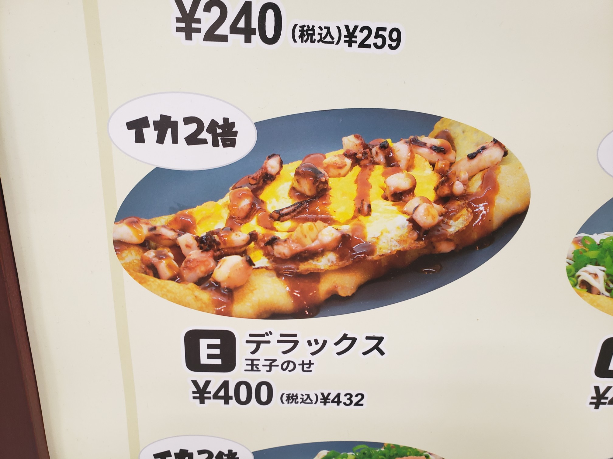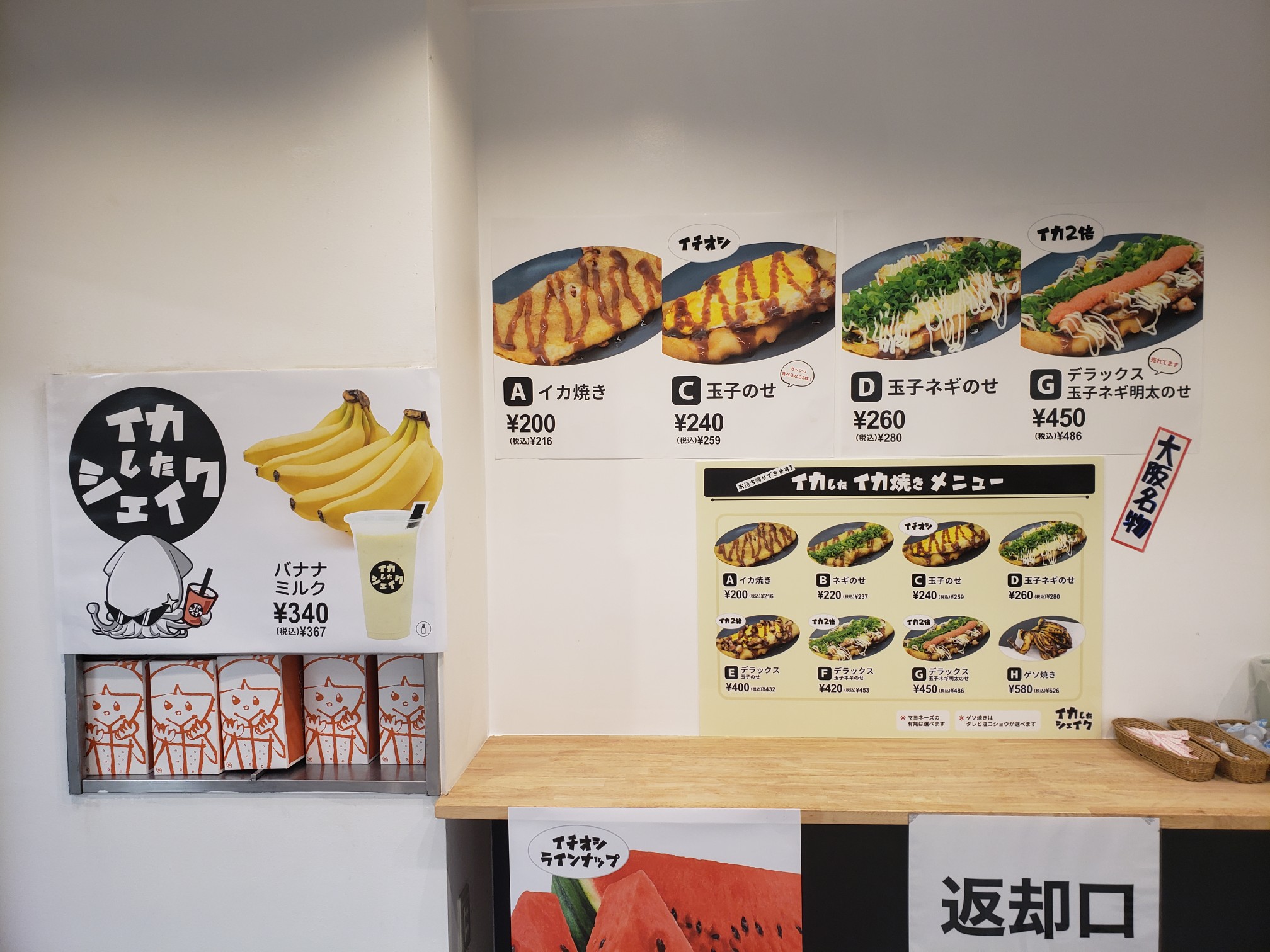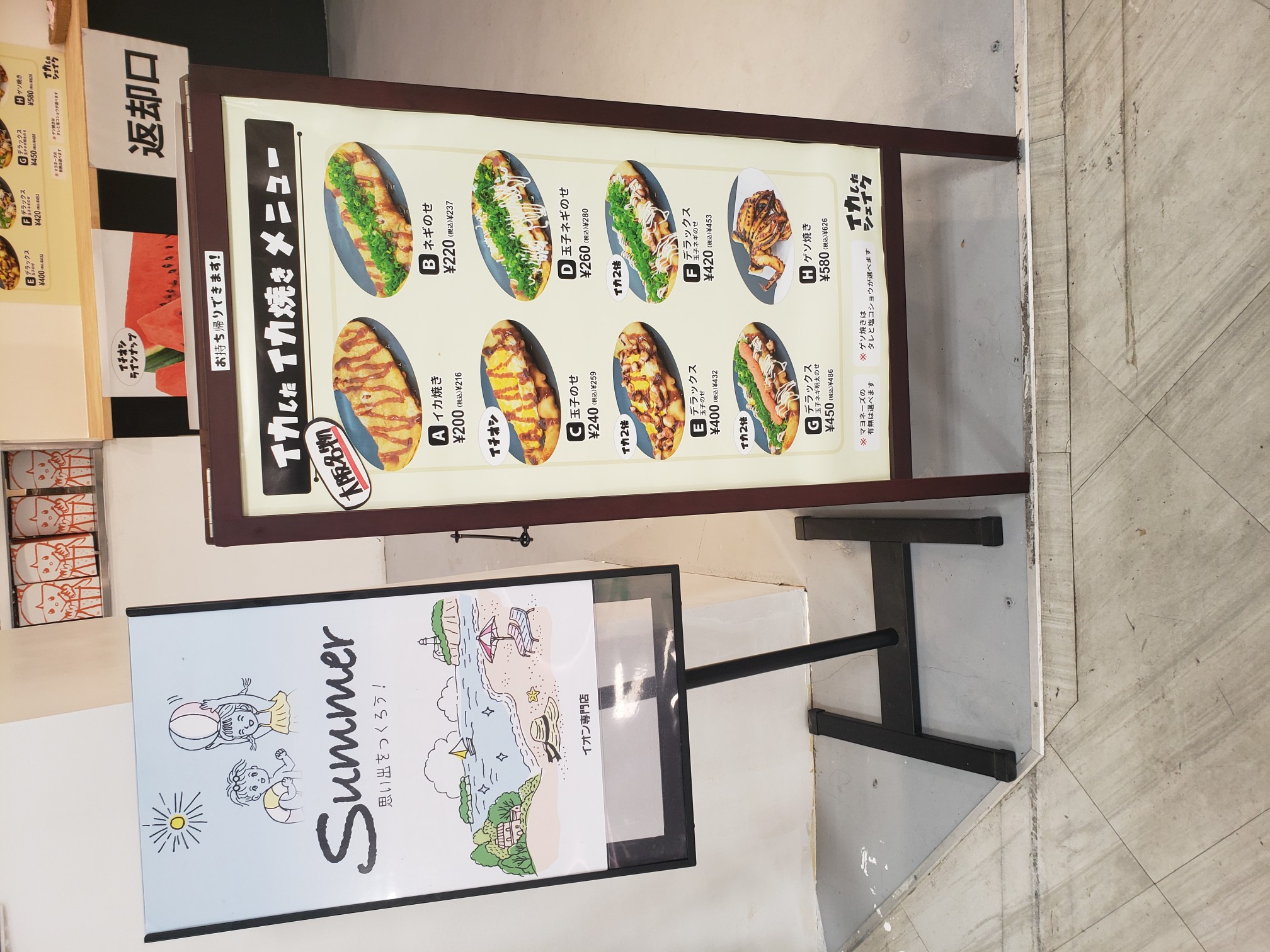 カウンターで改めてメニュー物色。単純なイカ焼きからちょっと贅沢なやつまで8種類が揃う。