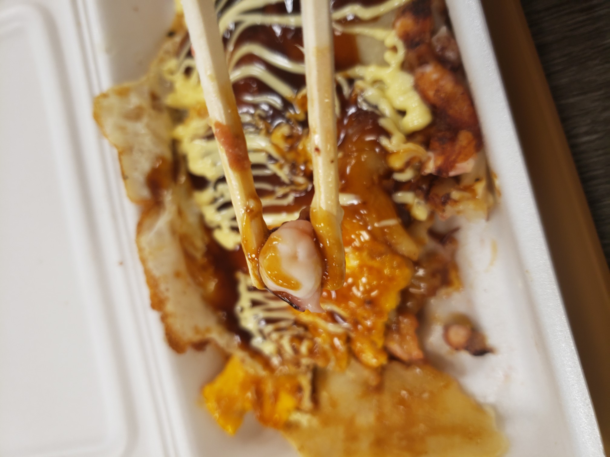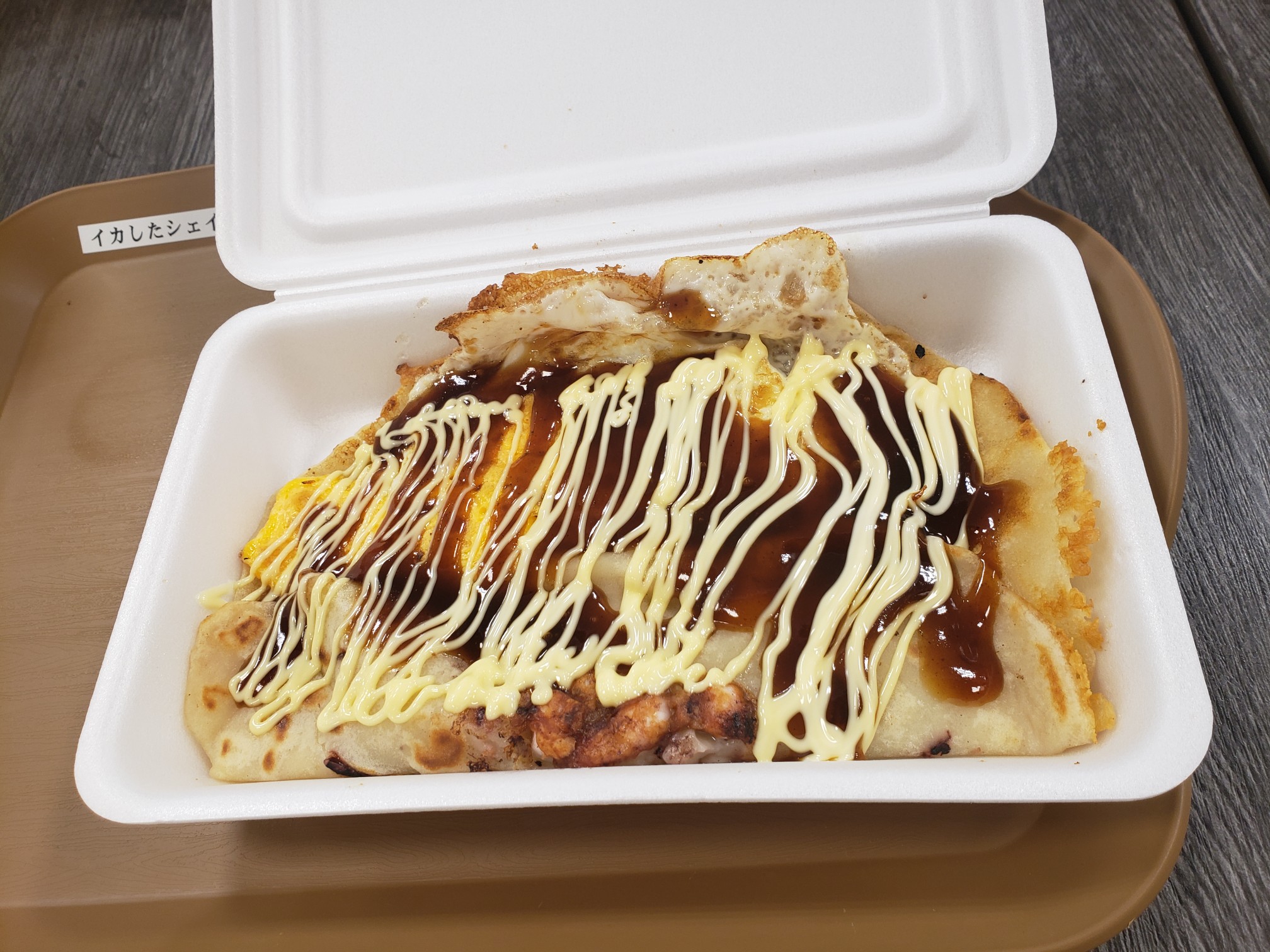 イカ焼きはまぁまぁの大きさ。ちょっとキャベツが入ったら甘みが出てええのになぁ。と言うか、それはお好み焼きかっ!