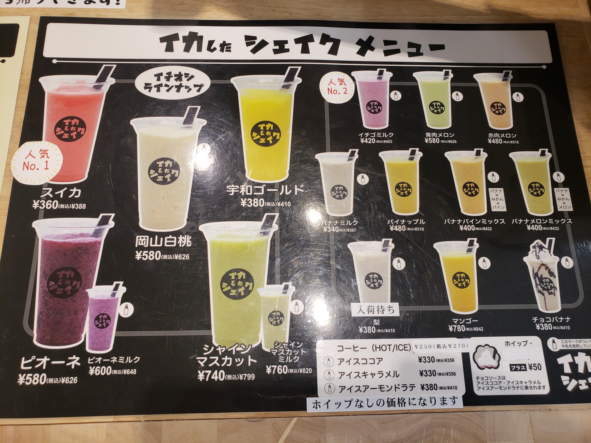 「イカでシェイク」のイカ=イカ焼き、シェイク=フルーツを使ったオリジナルシェイクのこと。