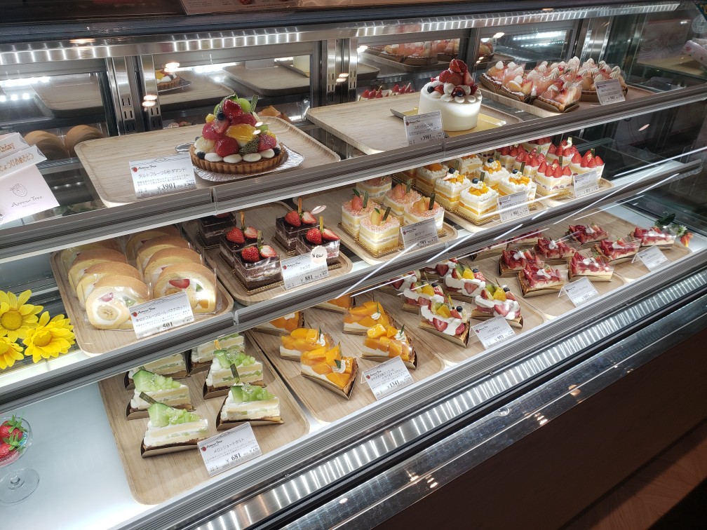 テイクアウトコーナーのショーケースには色鮮やかなケーキが並ぶ。