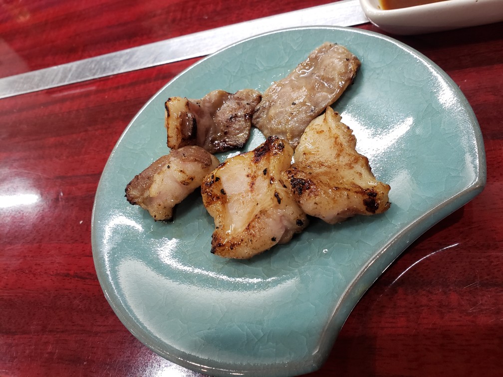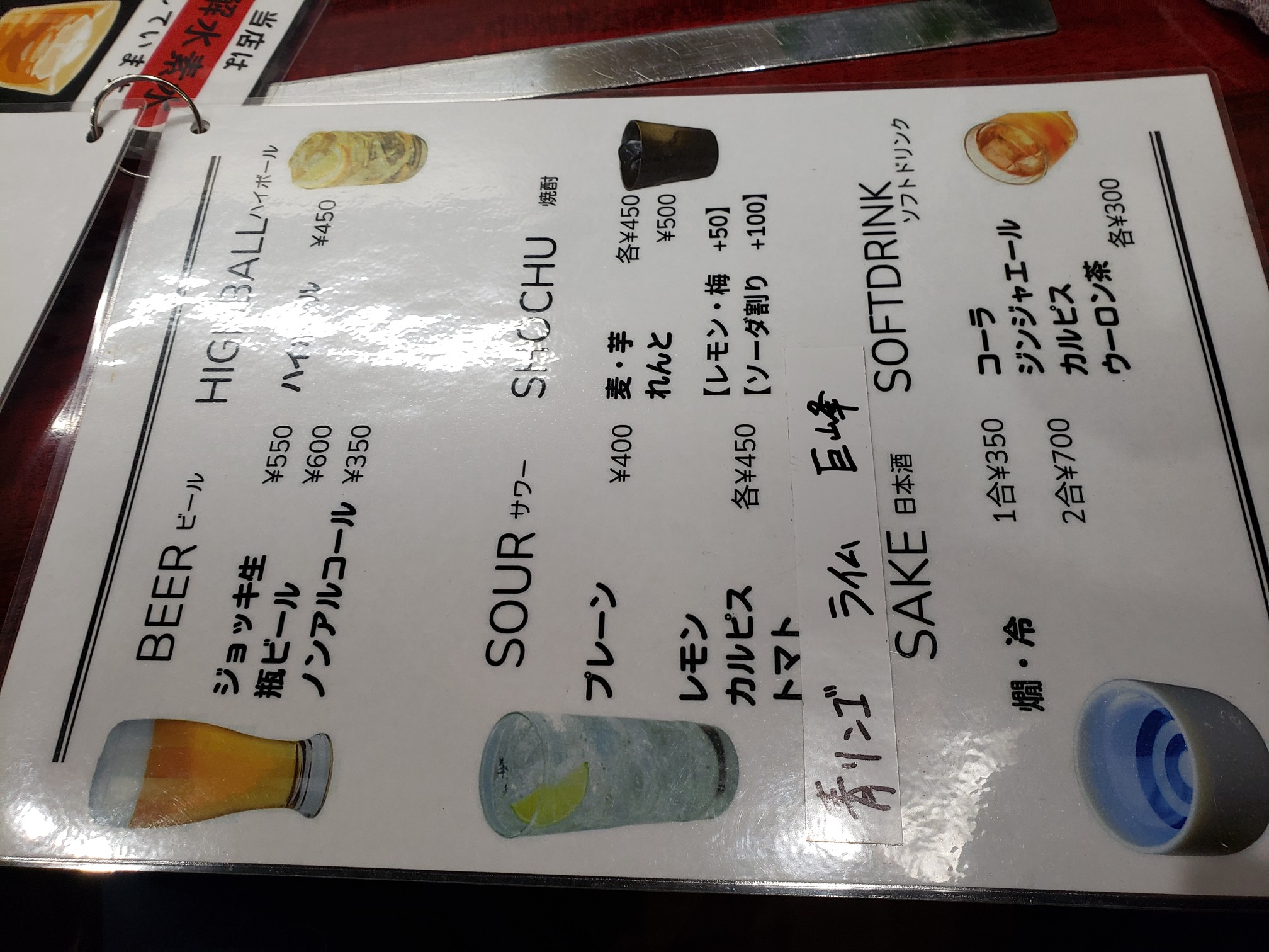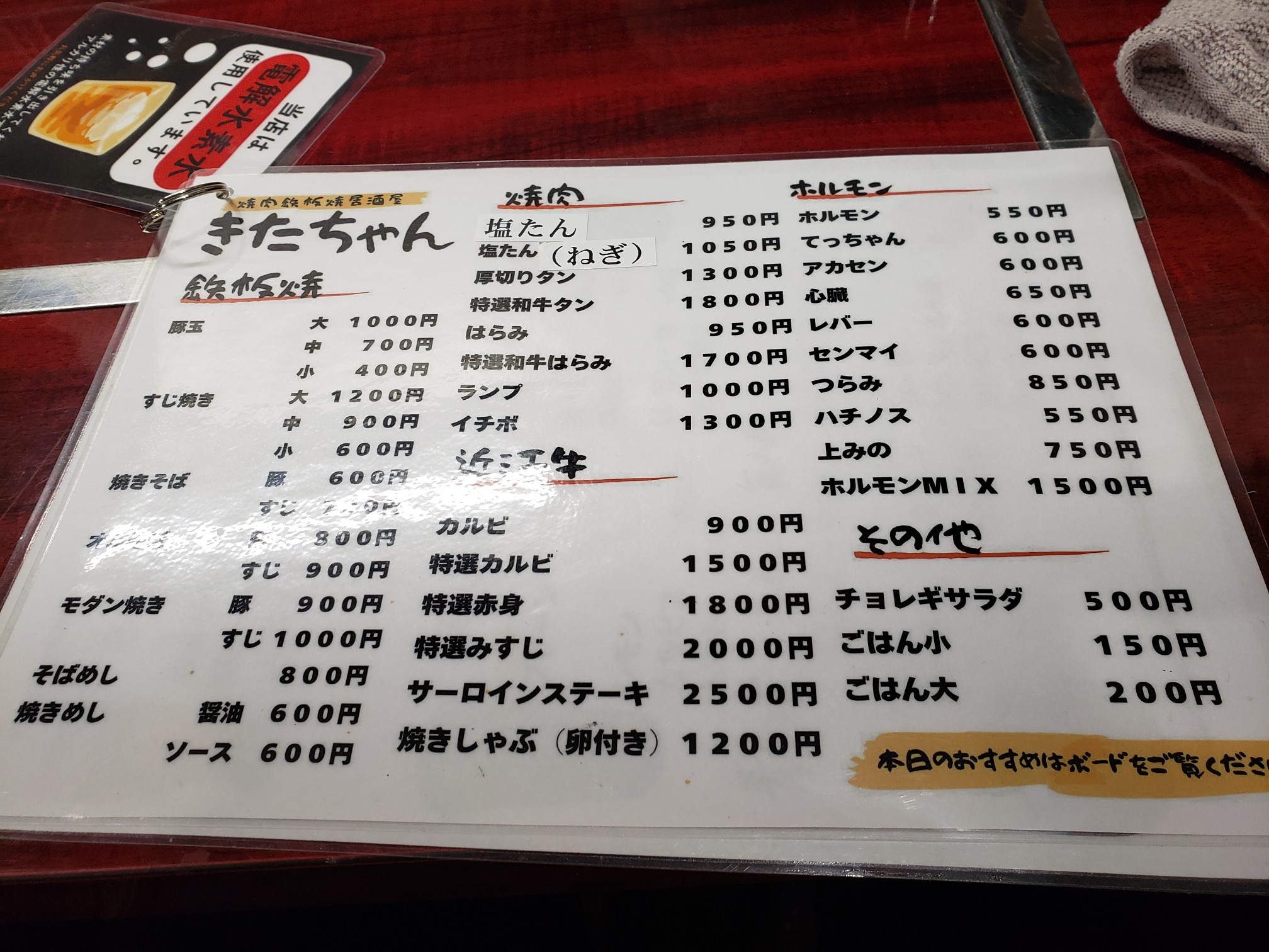 メニュー物色。お好み焼き、焼きそば、焼肉、ホルモンなど。全部厨房内で焼いてから提供する。