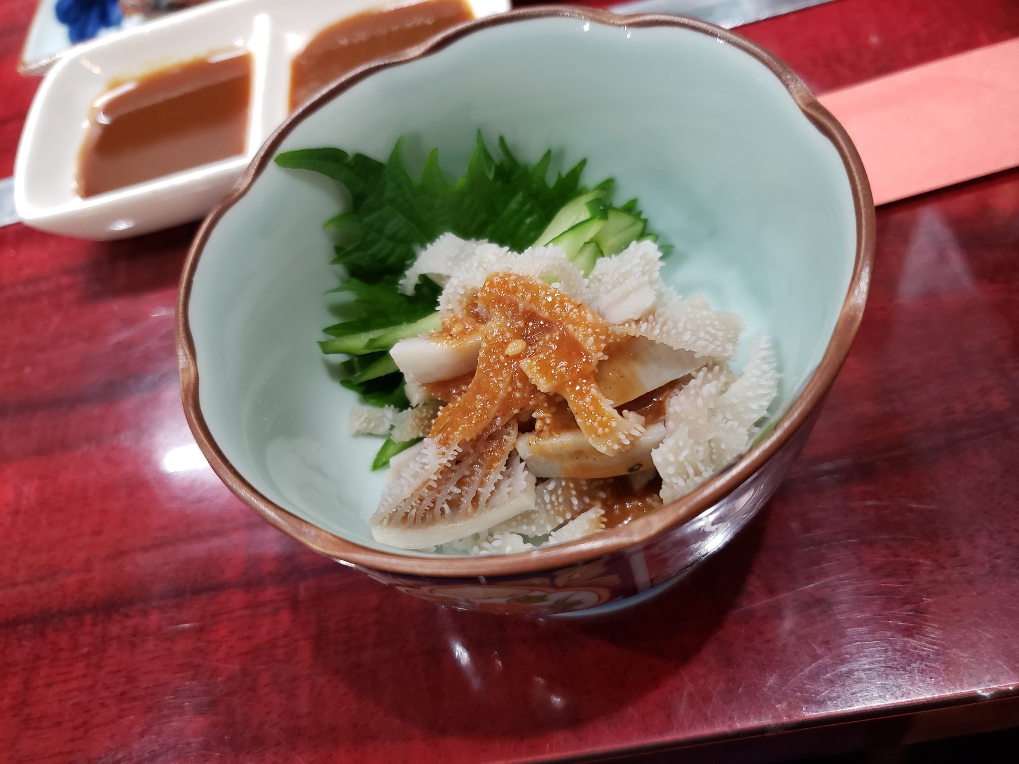 白センマイの湯引き。酢味噌で頂く、うんまい!