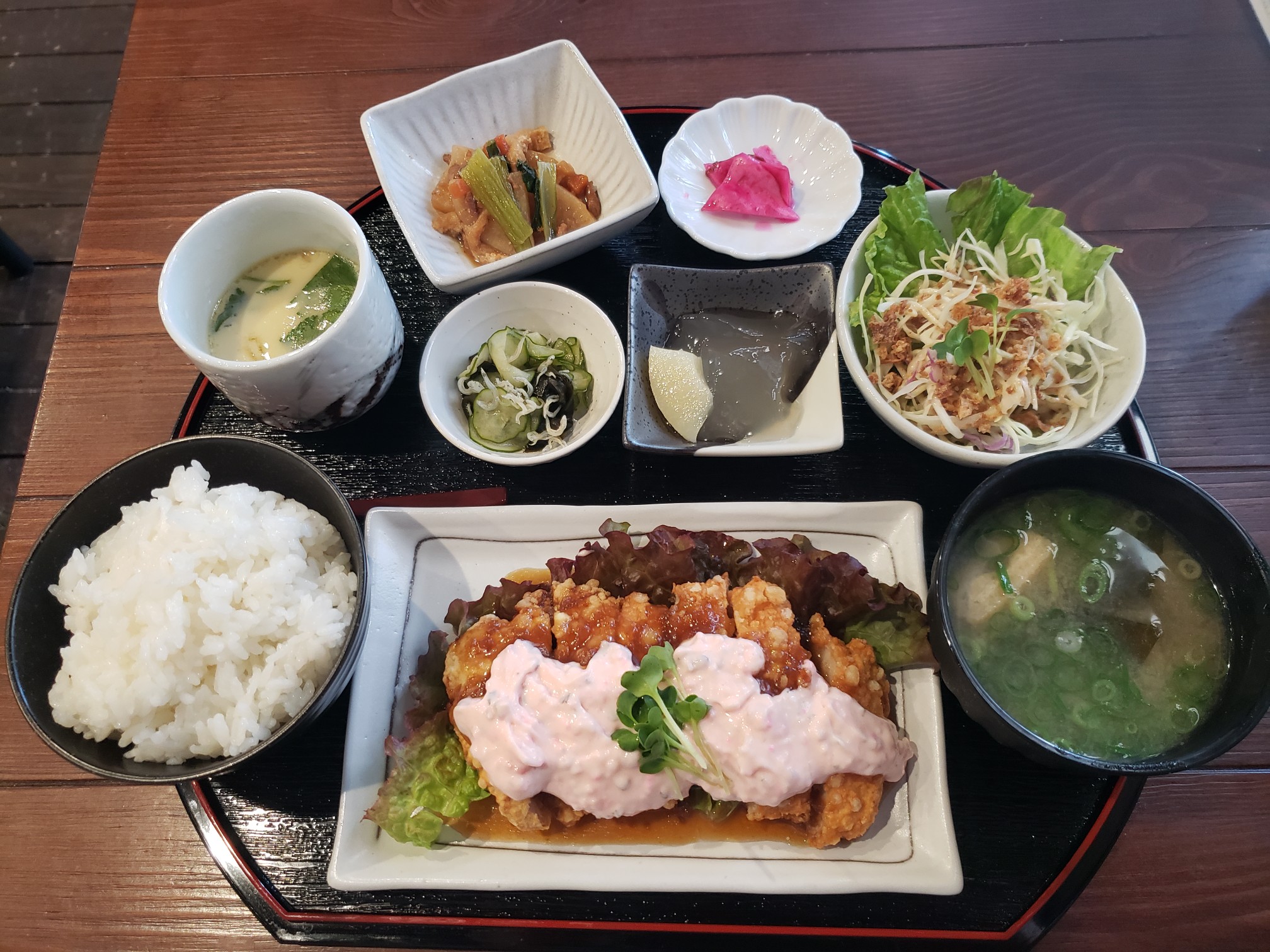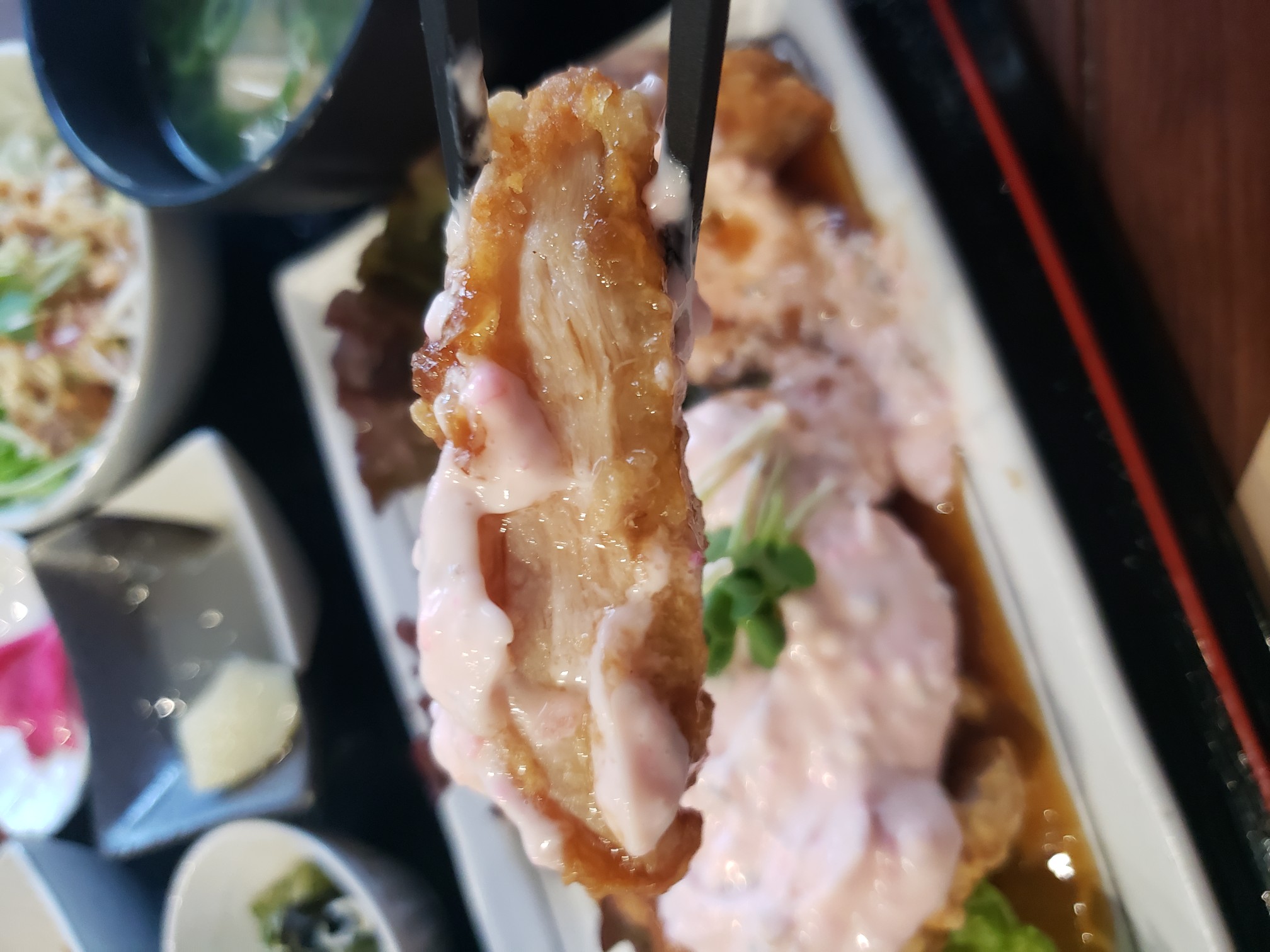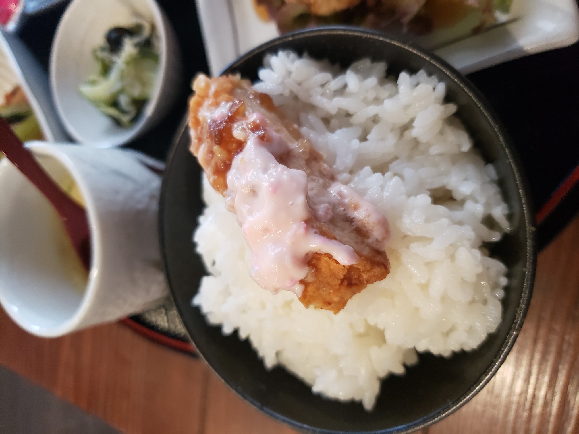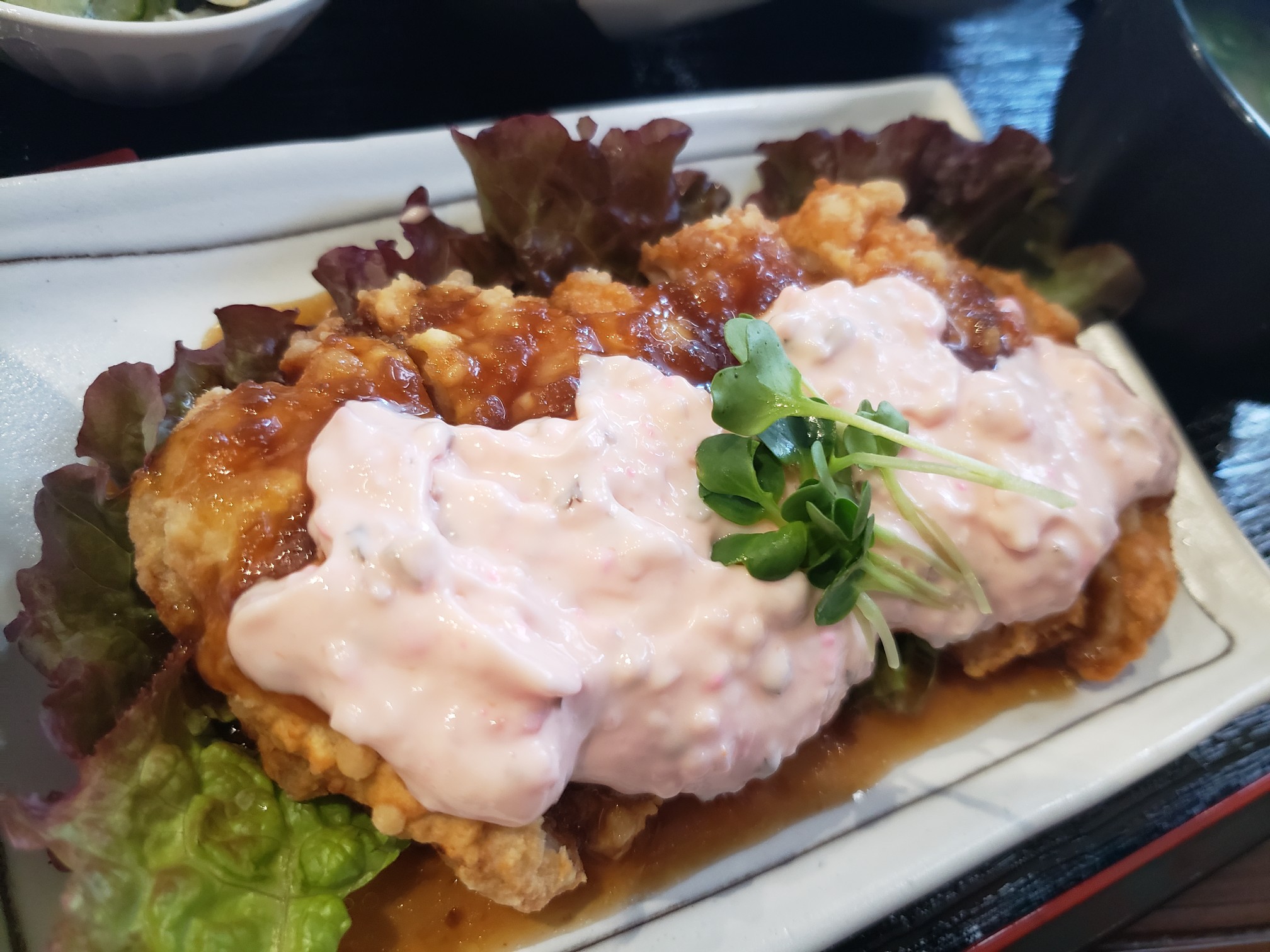 メインのチキン南蛮。甘いタレが掛かって、さらにたっぷりのタルタルソースが上に掛かる、うまそー!
