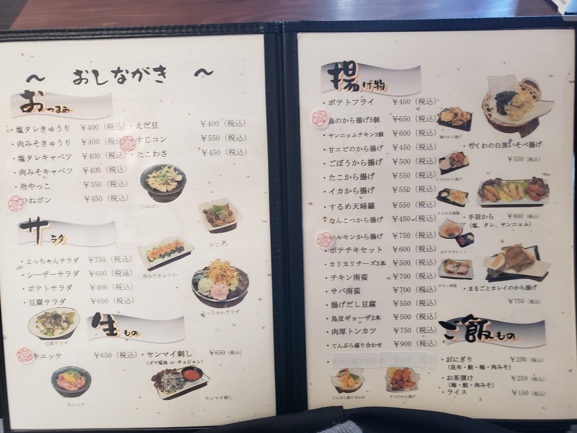 居酒屋メニュー。揚げ物のメニューが豊富。