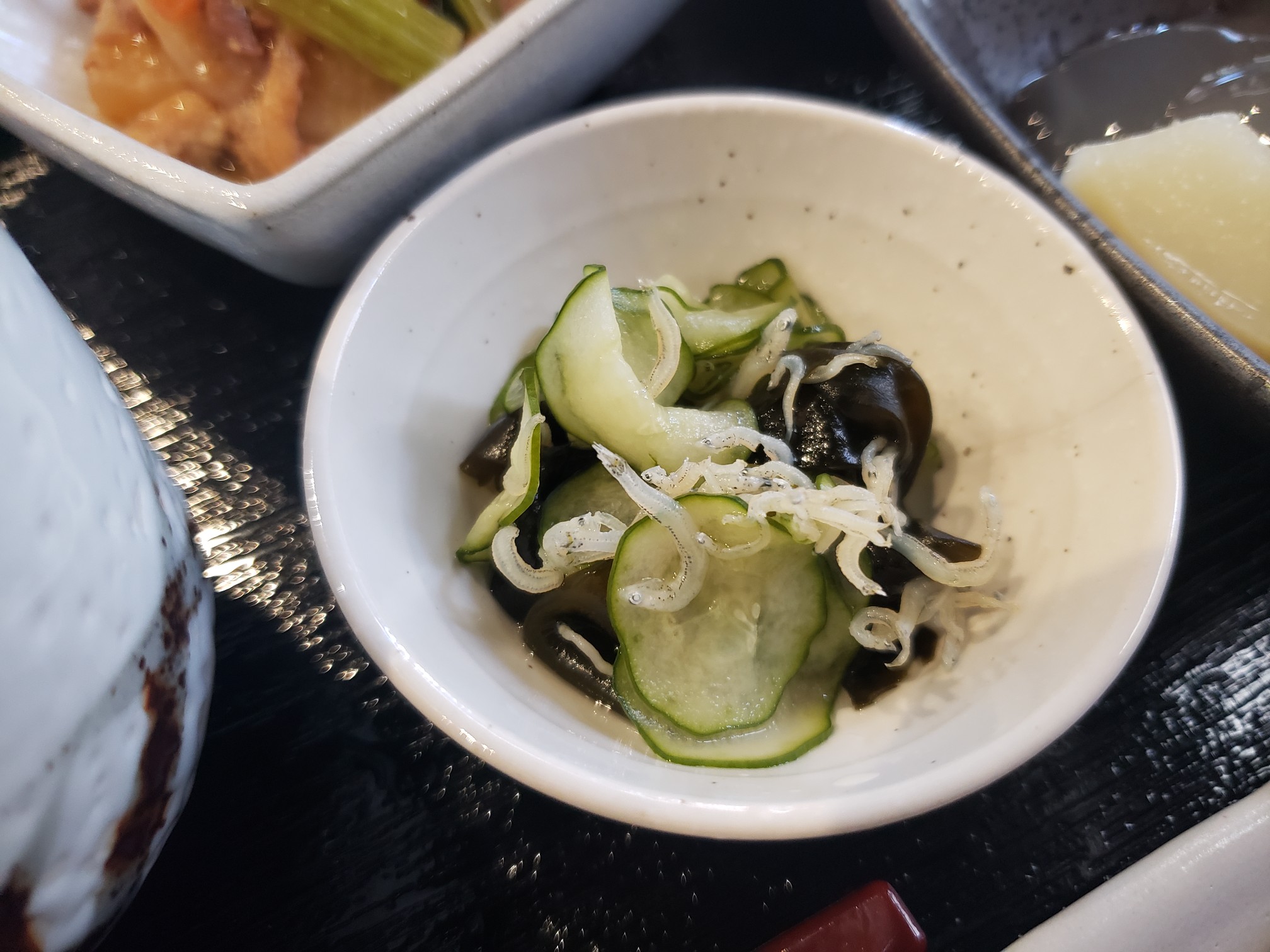 じゃことわかめときゅうりの酢の物。居酒屋らしい小鉢、うんまい!