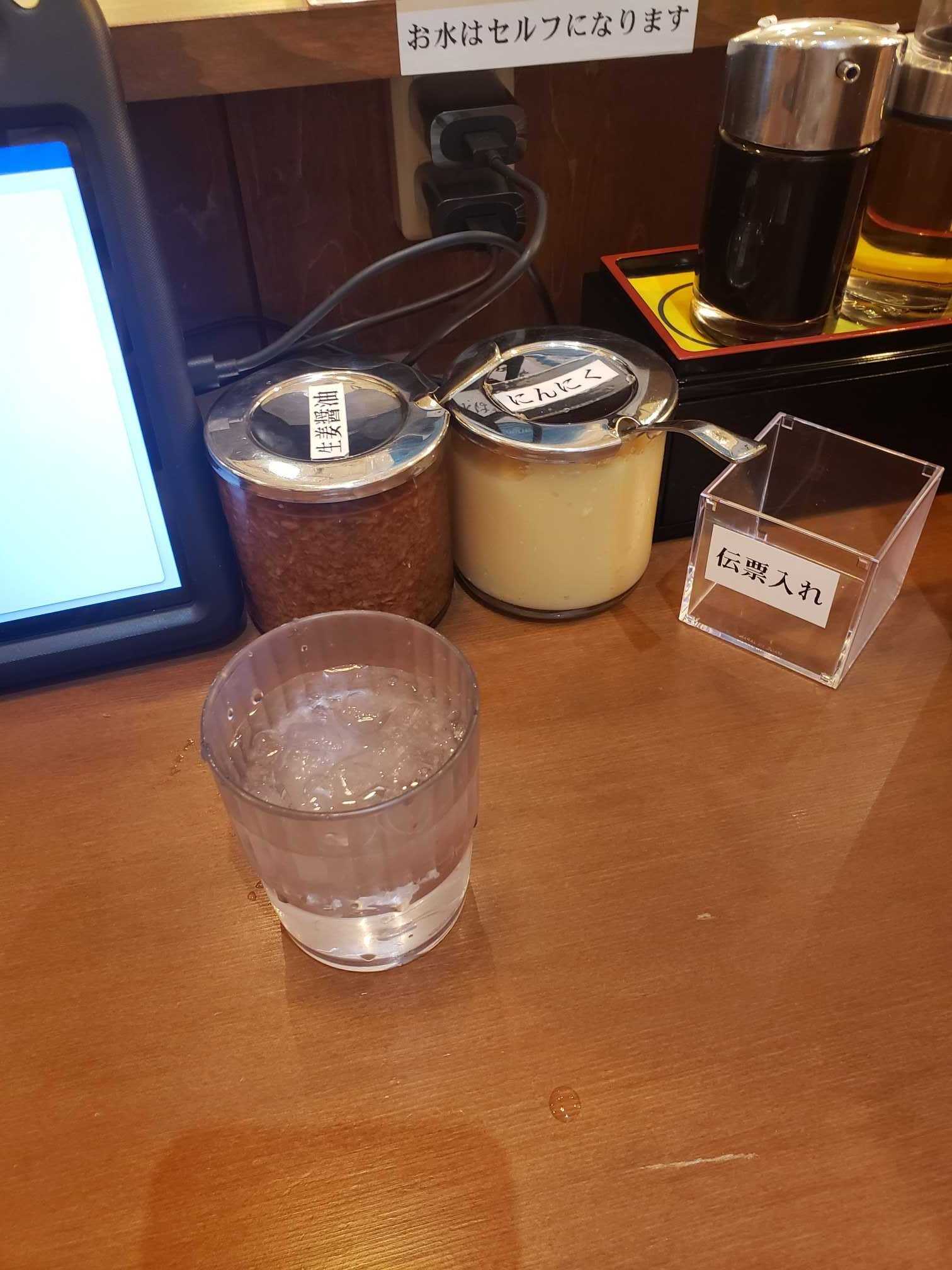 お冷はセルフで用意。今回はカウンター席中腹あたりに陣張り。