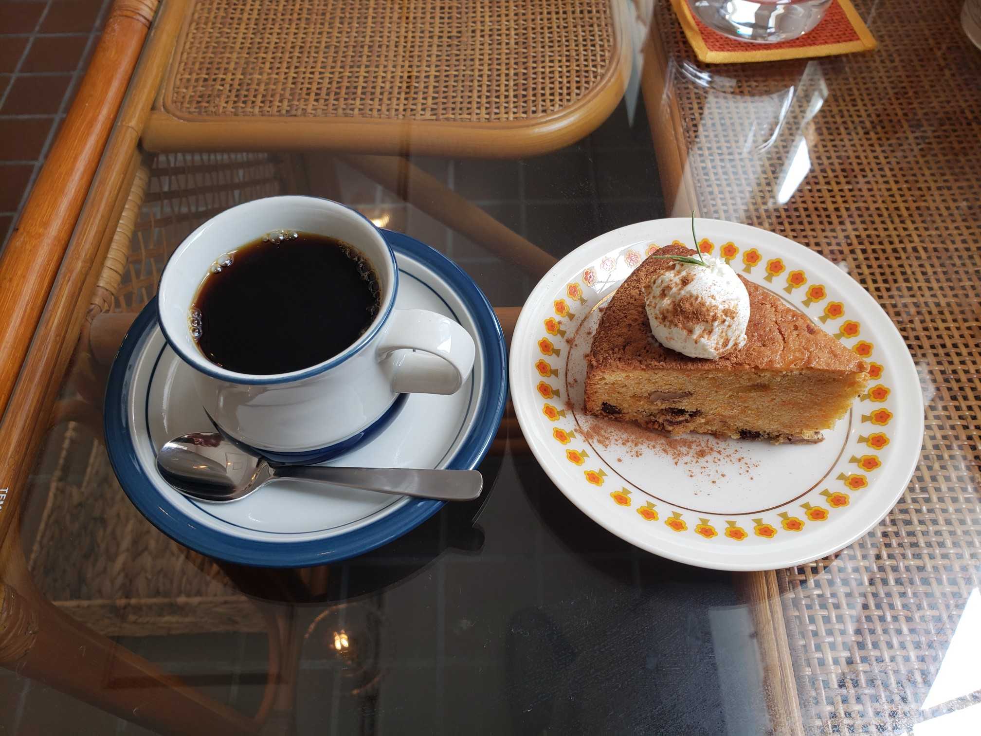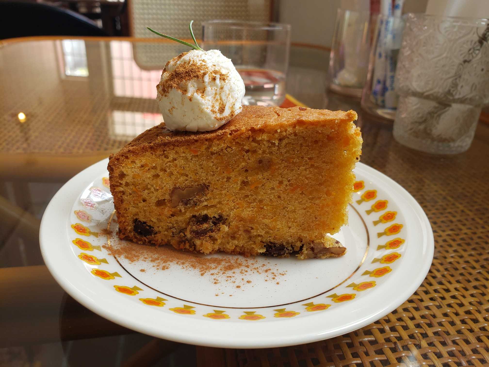 キャロットケーキは甘さ控えめ。クルミとレーズンが仕込んであっていいアクセントに。シナモンがベストマッチ、うんまい!!